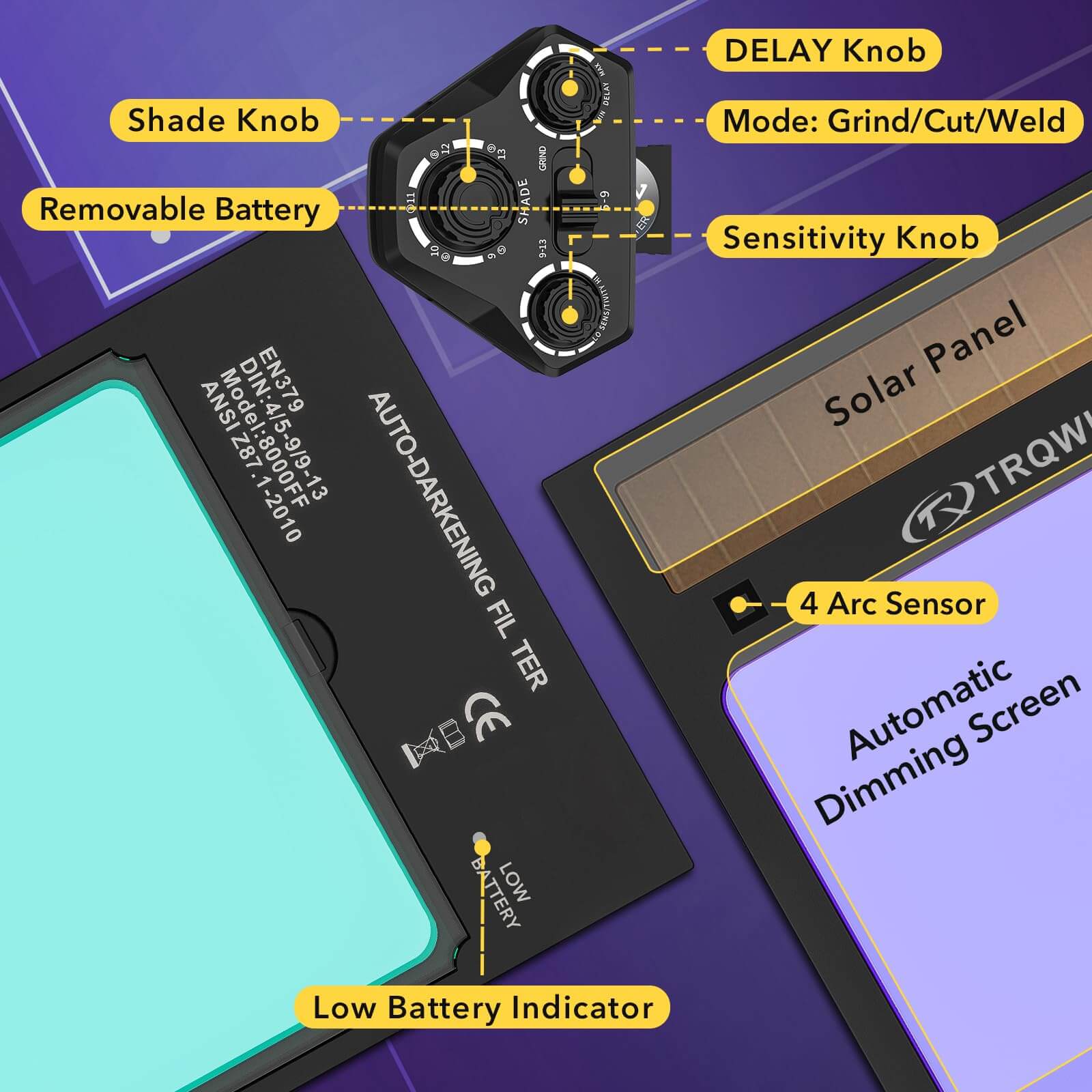 【Highly Sensitive And Adjustable】Equipped with delay and sensitivity setting knobs to suit different environments and tasks. 4 arc sensor, adjustable shade range 4/5-9/9-13 and the time from dark to bright state is within 0.2s to 1.0s (delay settings). 1/30000s fast response time provides better protection for welders.
