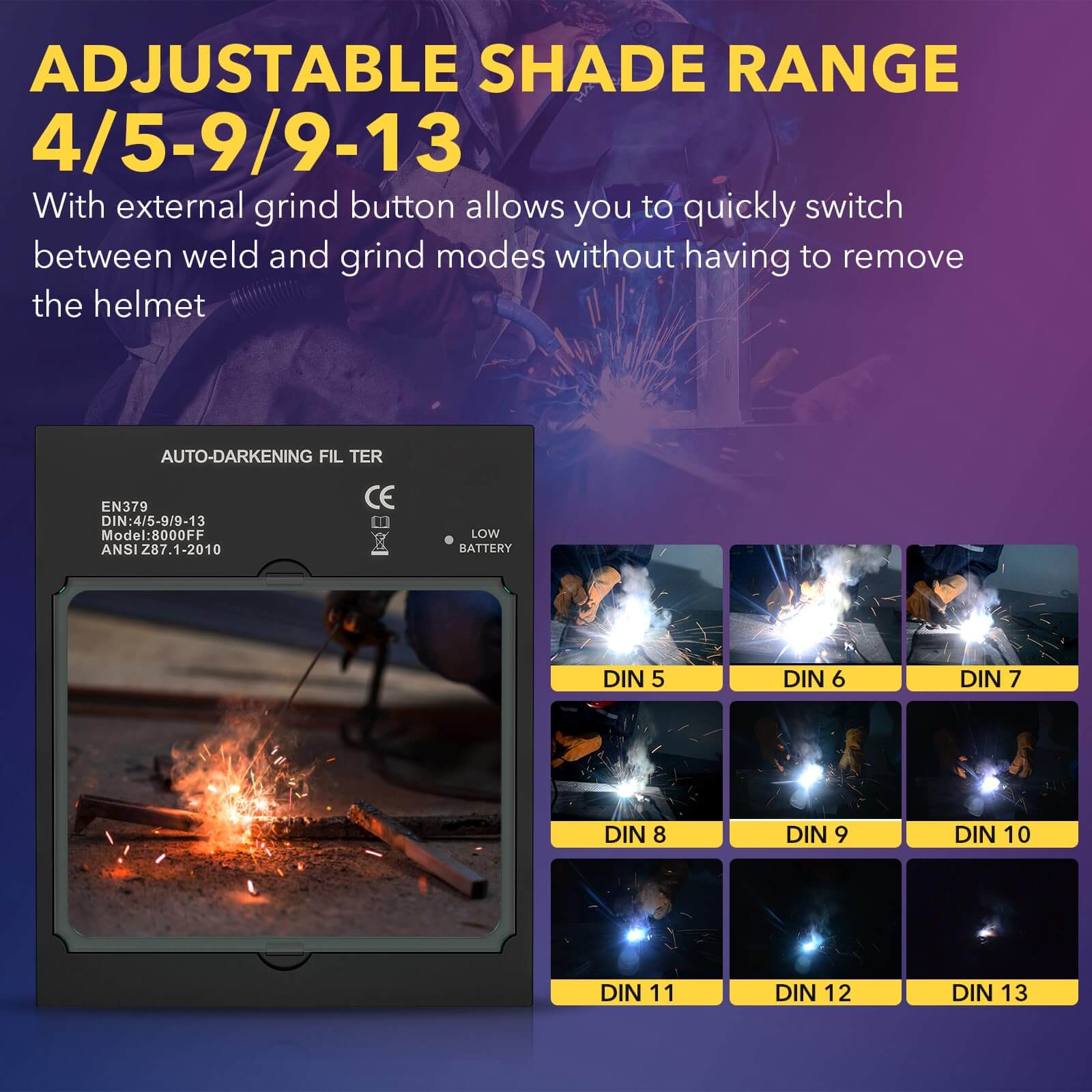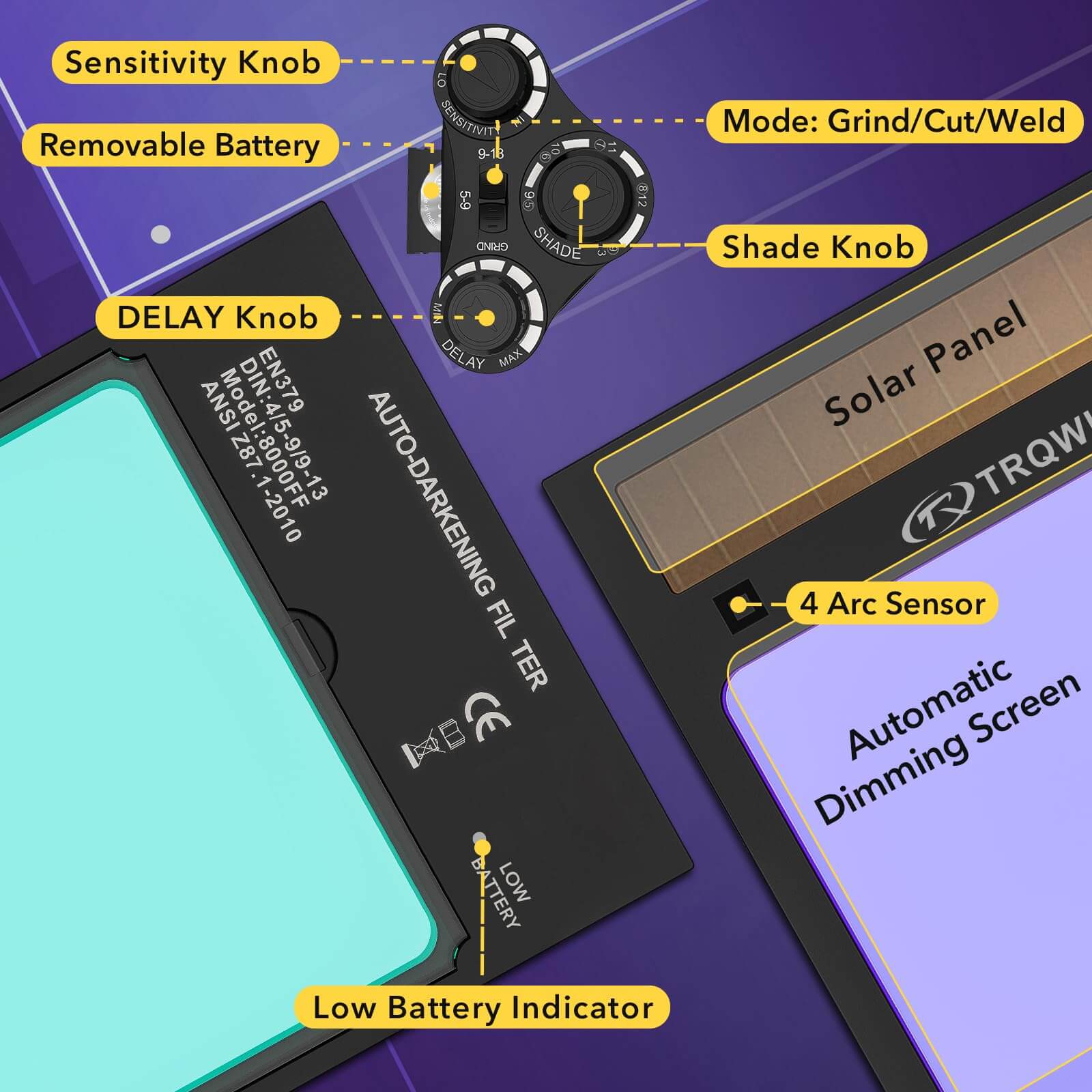 【Highly Sensitive And Adjustable】Equipped with delay and sensitivity setting knobs to suit different environments and tasks. 4 arc sensor, adjustable shade range 4/5-9/9-13 and the time from dark to bright state is within 0.2s to 1.0s (delay settings). 1/25000s fast response time provides better protection for welders.