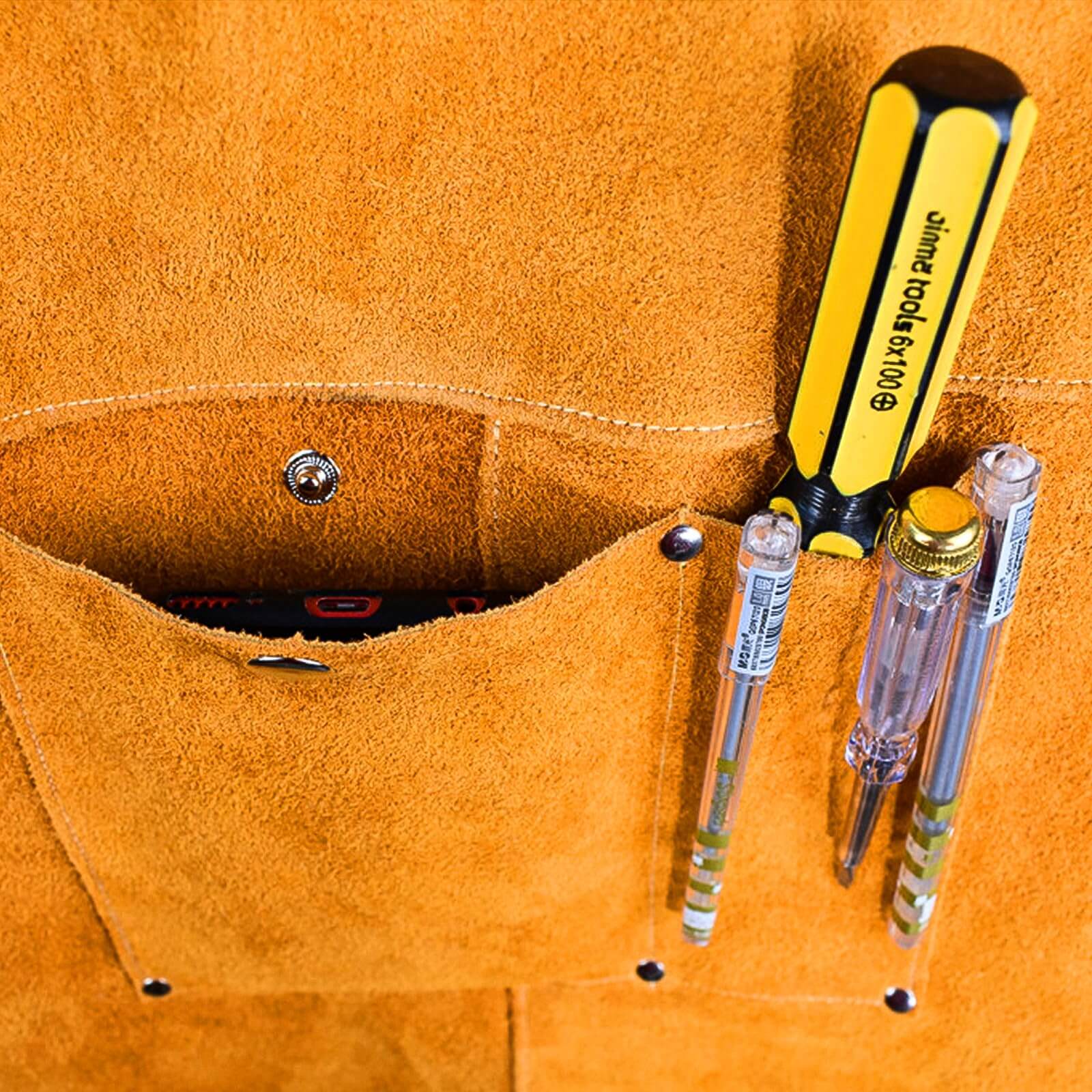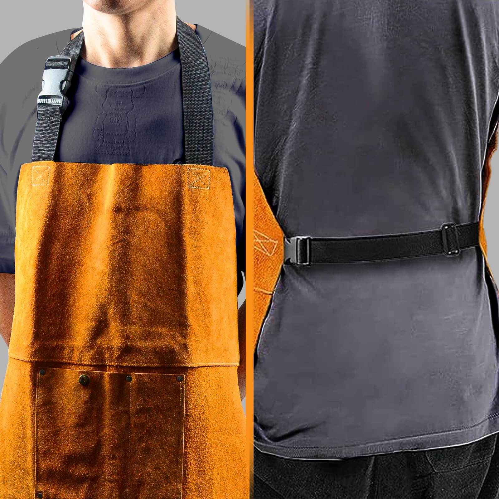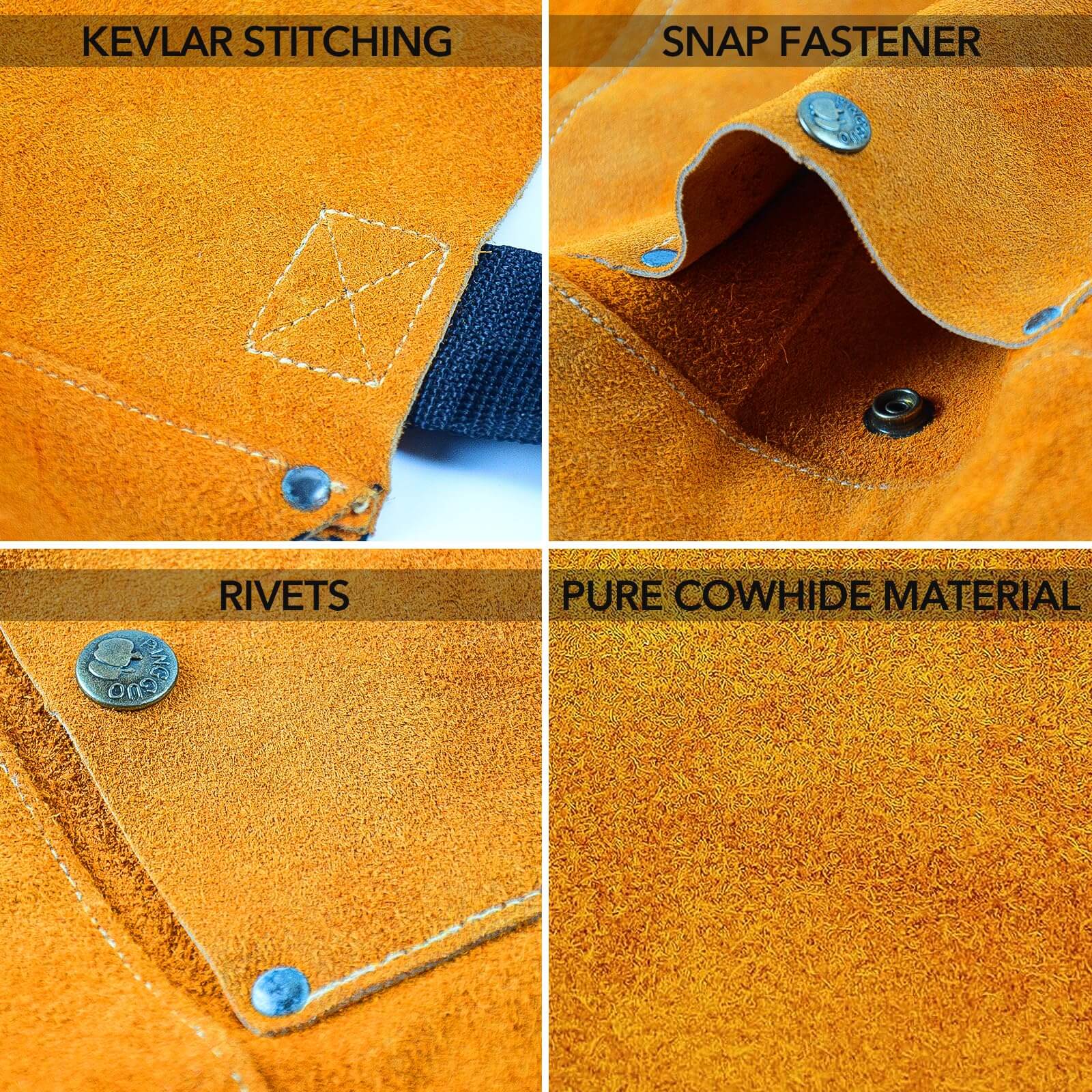 REINFORCED STITCHING: Sewn with Kevlar thread (the most reliable reinforcement in protective gear) for comfortable wear and durability. Rivet design on pocket edges makes the leather welding apron robust and sturdy.