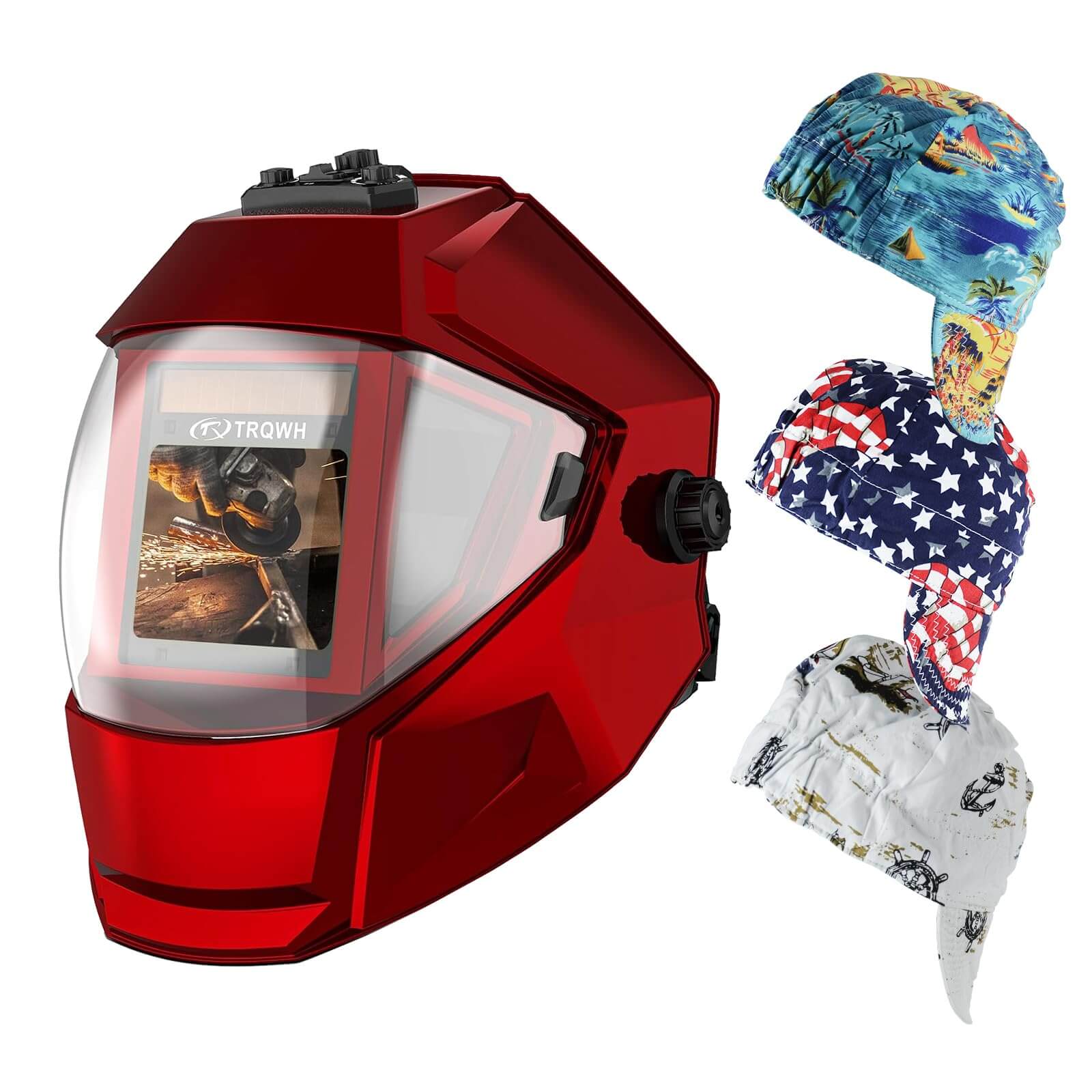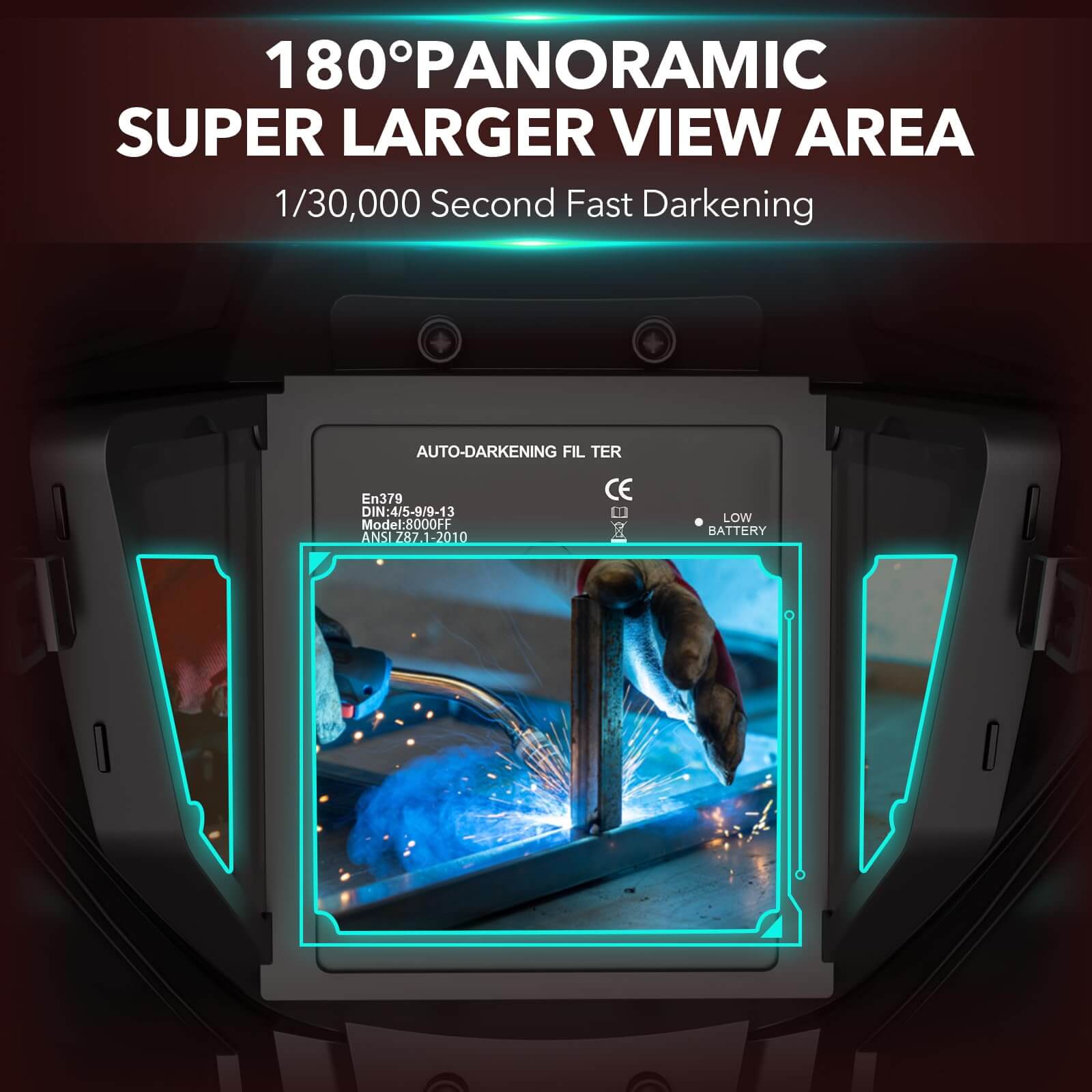【180° LARGE VIEW & SUPERIOR CLARITY】TRQWH panoramic 180° large viewing welding helmet with new true color technology and large viewing screen 3.94" x 3.15" with side view. Top 1/1/1/1 optical clarity of the lens, restore every details of working conditions. Creates a wide field of view, allowing the welder to have a higher field of vision and comfort.