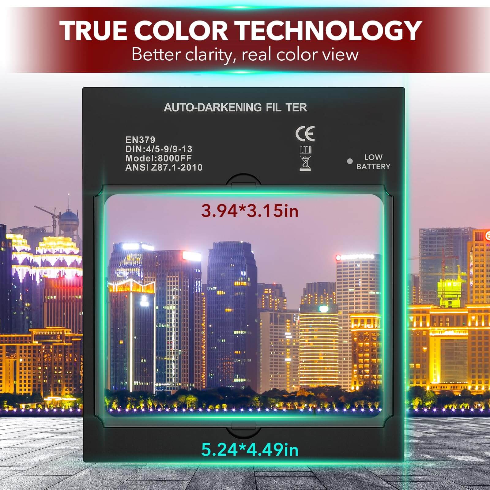 【ULTIMATE EYE PROTECTION WELDING HELMET】Come with high-end auto-darkening lens with 4 arc sensors, that switches from light to dark in 1/25000 sec when the arc light appears. The lens is made of high-quality double liquid crystal layers and optical coating filter, which can resist 99% of the harmful light to the eyes. Meets ANSI Z87.1/ EN379 CE/ CSA Z94.3 standards.