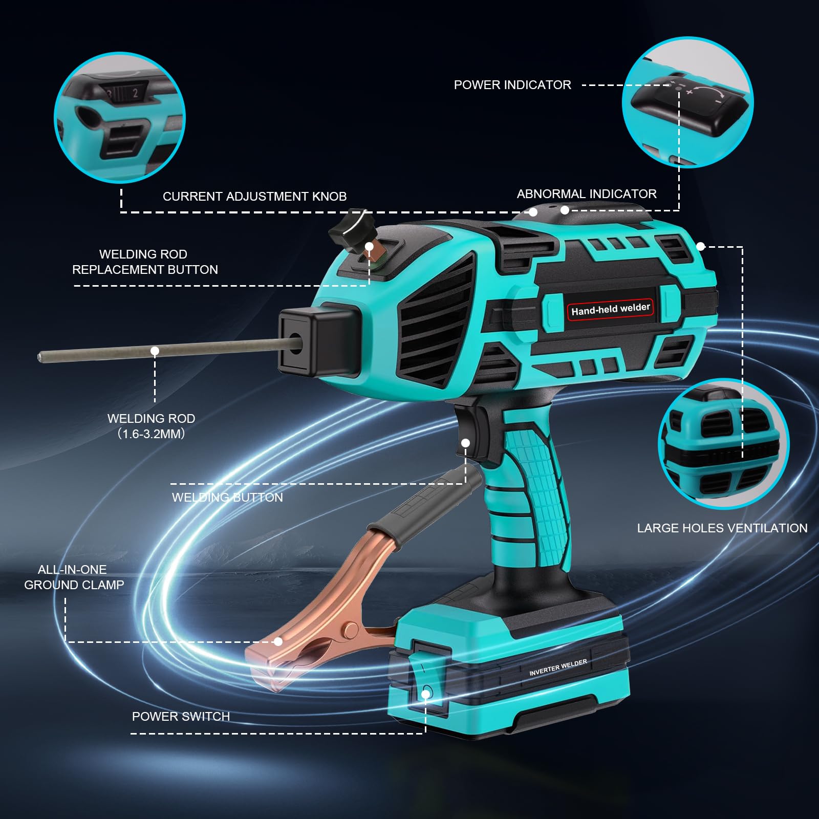 5 Variable Current Adjustment: This handheld welder supports 20-120Amp adjustable output, features a simple knob design with 5 variable current adjustments, wdich is suitable for all sizes of welding rods 1/16", 5/64", 3/32", 1/8".