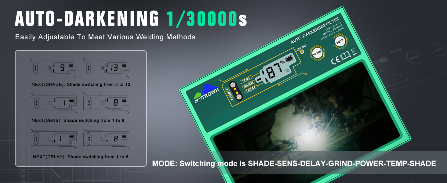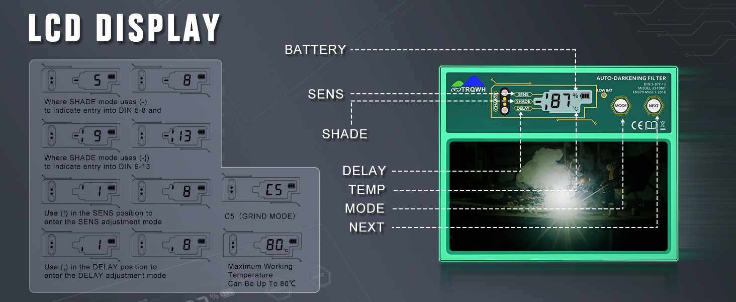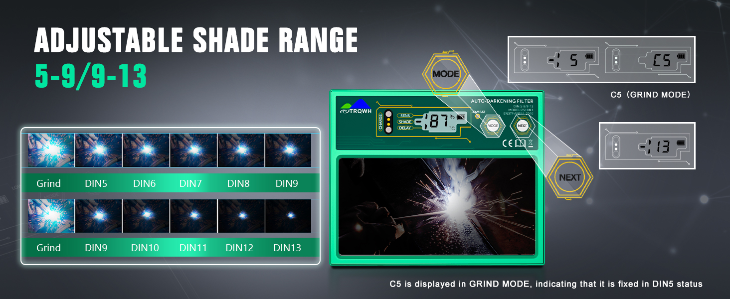 【Digital Display】LCD display and button settings. Press the "Shade" button to choose Welding Mode (Shade 5, Shade 6, Shade 7, Shade 8, Shade 9, Shade 10, Shade 11, Shade 12, Shade 13) and Grinding Mode (C5).