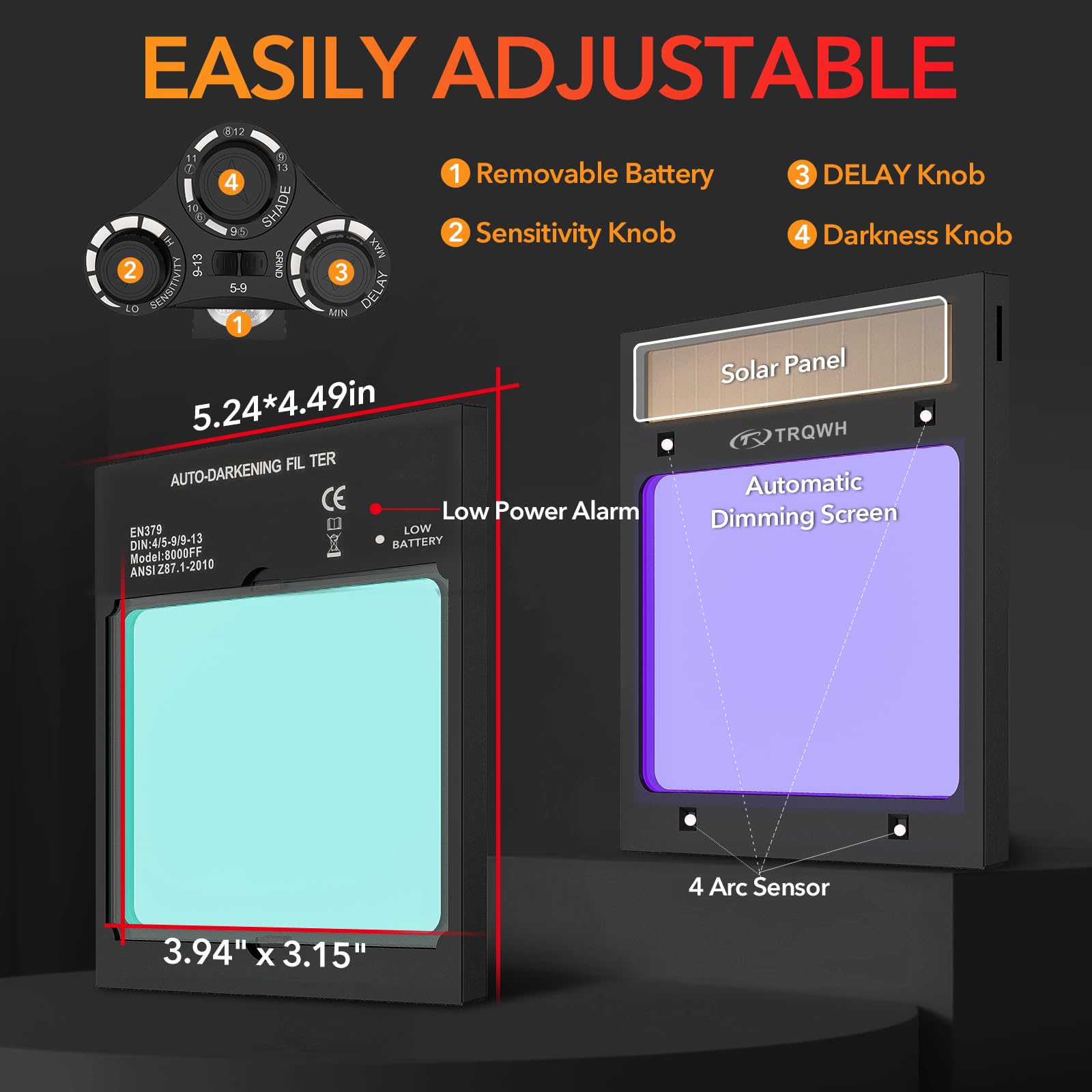【Zero injury welding helmet】Welding helmet has a delay and sensitivity setting knob, you can adjust the most suitable settings for your work according to different work scenarios. DIN4 in the light state, DIN5-9/9-13 in the dark state. The most powerful is the TRQWH welding helmet has 4 arc sensors that can switch from light to dark in 1/25,000 seconds. The auto-darkening filter is made of high-quality liquid crystal and optical coating, which can resist 99% of the harmful light to the eyes.