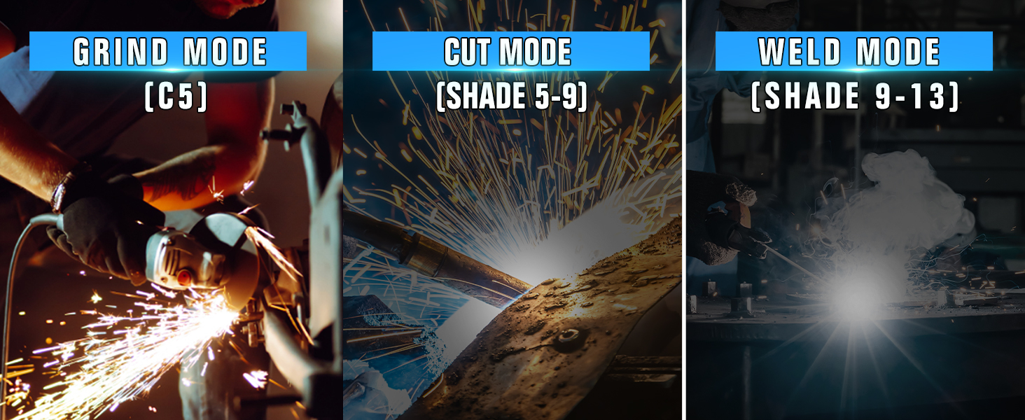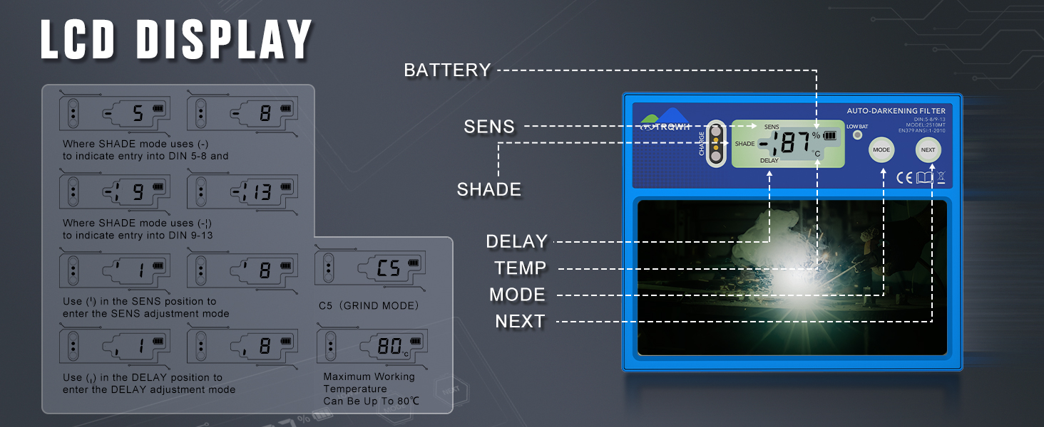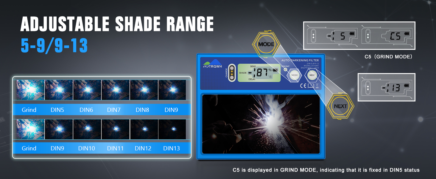 【Digital Display】LCD display and button settings. Press the "Shade" button to choose Welding Mode (Shade 5, Shade 6, Shade 7, Shade 8, Shade 9, Shade 10, Shade 11, Shade 12, Shade 13) and Grinding Mode (C5).