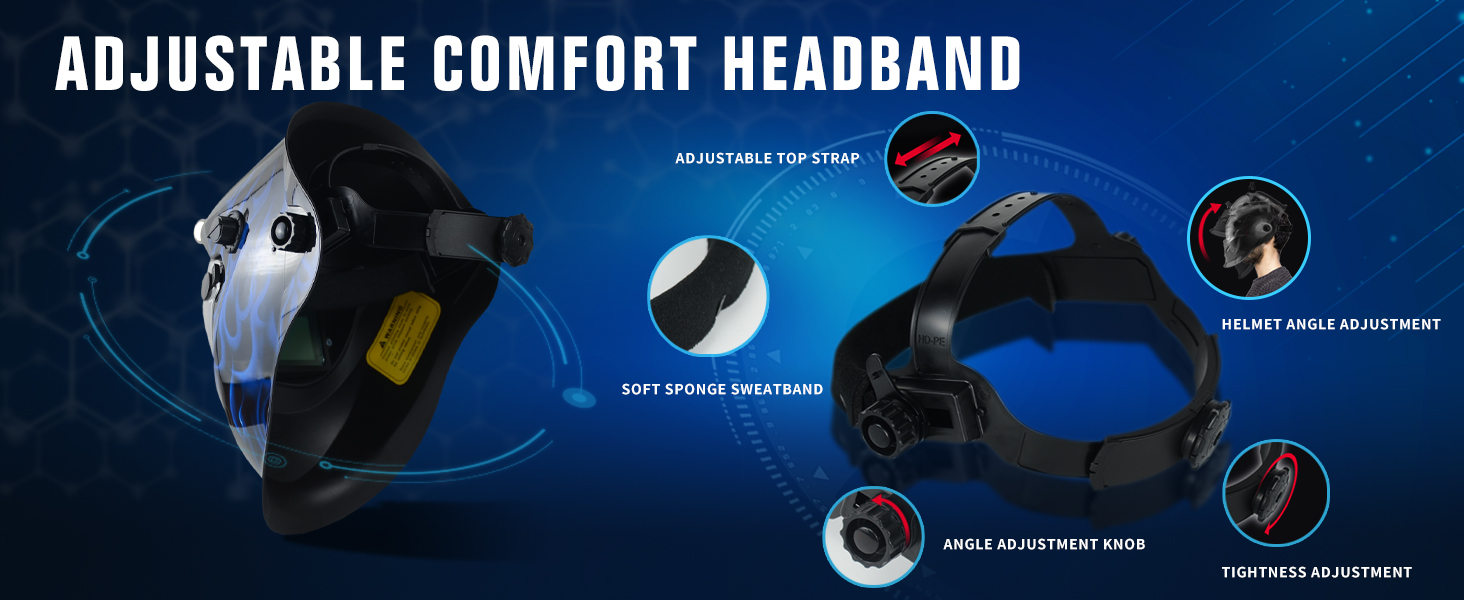 【Comfort Durable Welding Mask】Balanced with an adjustable and comfortable headgear. Ergonomically welding helmet makes it comfortable and easy to wear. Thickened sponge forehead will protect you from injury. The knobs on both sides can adjust the angle, and the knob at the back can adjust the tightness of the headband, suitable for people with different head circumference