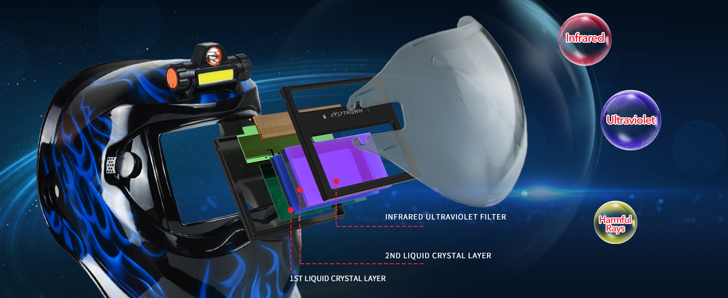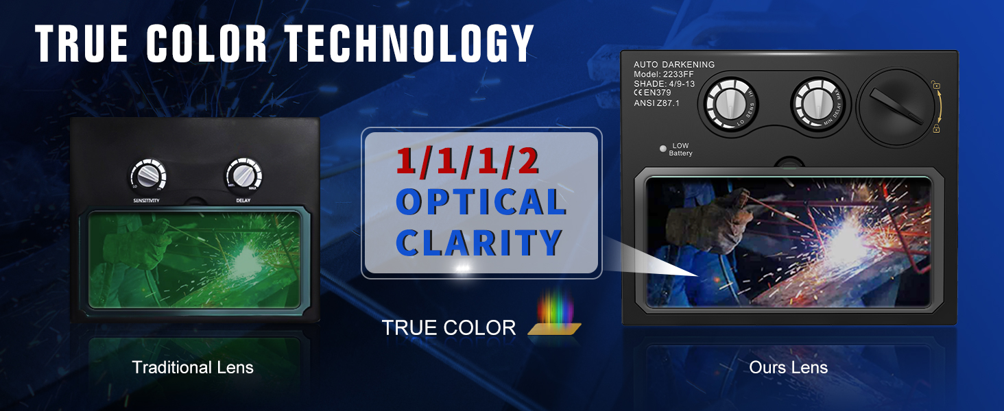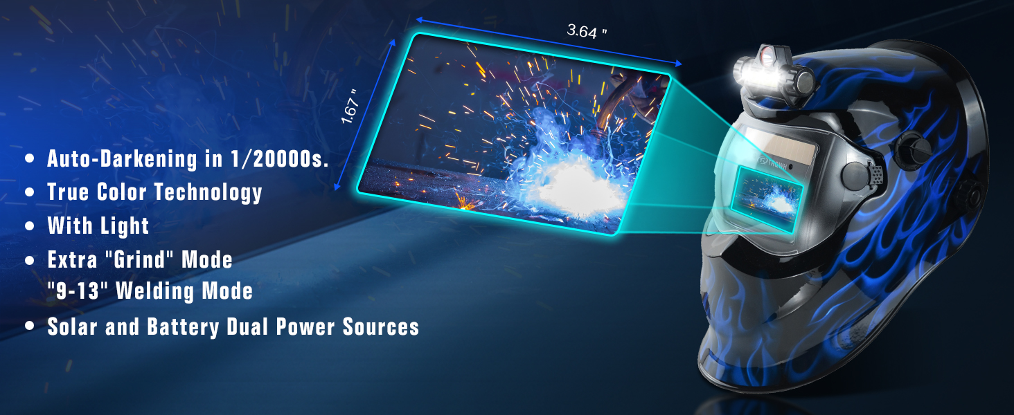 TRQWH auto darkening welding helmet with LED light. The welding hood with newly upgraded true color technology , 1-1-1-2 optical clarity rating restore every details of working conditions, improved visibility and reduced your eye strain.