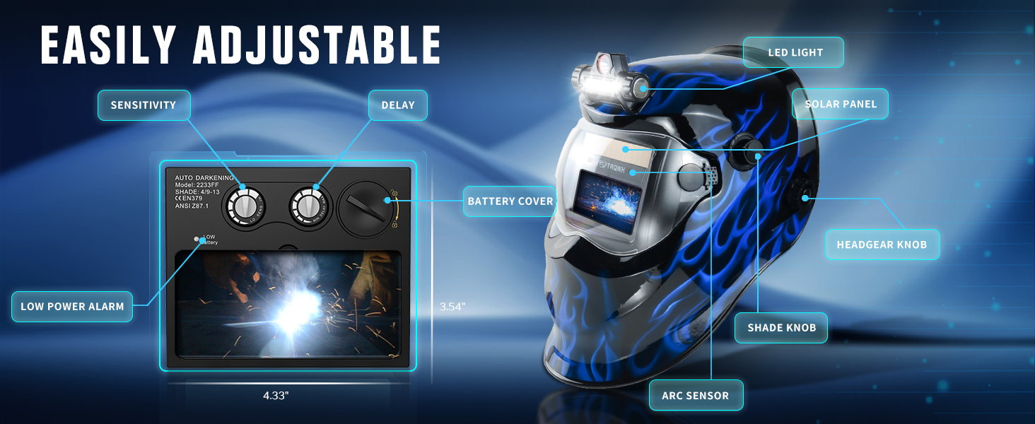 【Ultimate Eye Protection Welding Helmet】Come with high-end auto-darkening lens, that switches from light to dark in 1/20000 sec when the arc light appears. The lens is made of high-quality double liquid crystal layers and optical coating filter, which can resist 99% of the harmful light to the eyes. Meets ANSI Z87.1/ EN379 CE/ CSA Z94.3 standards