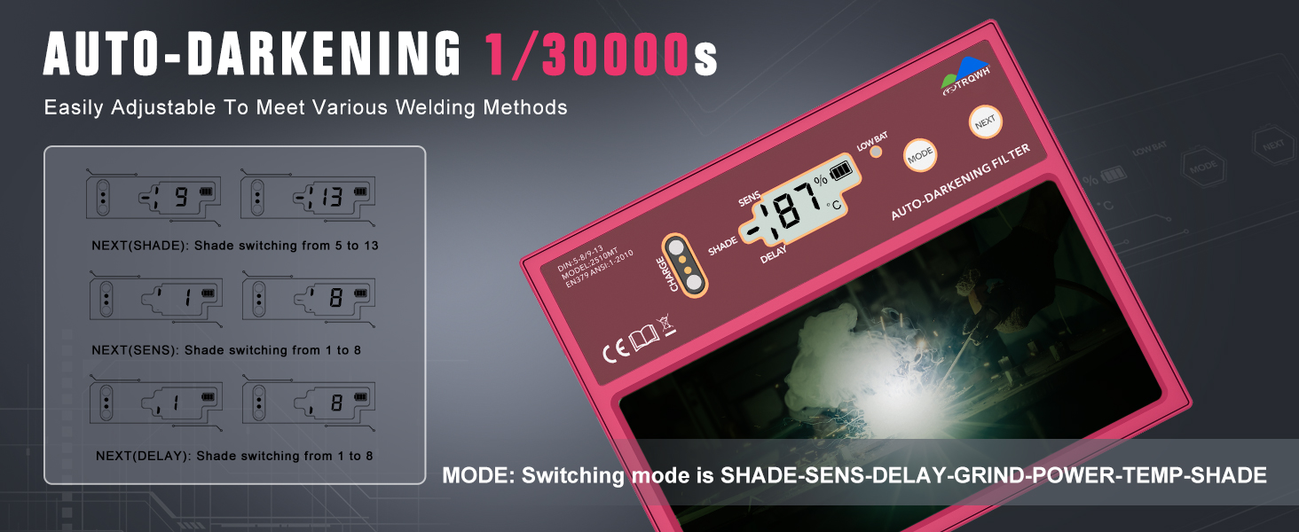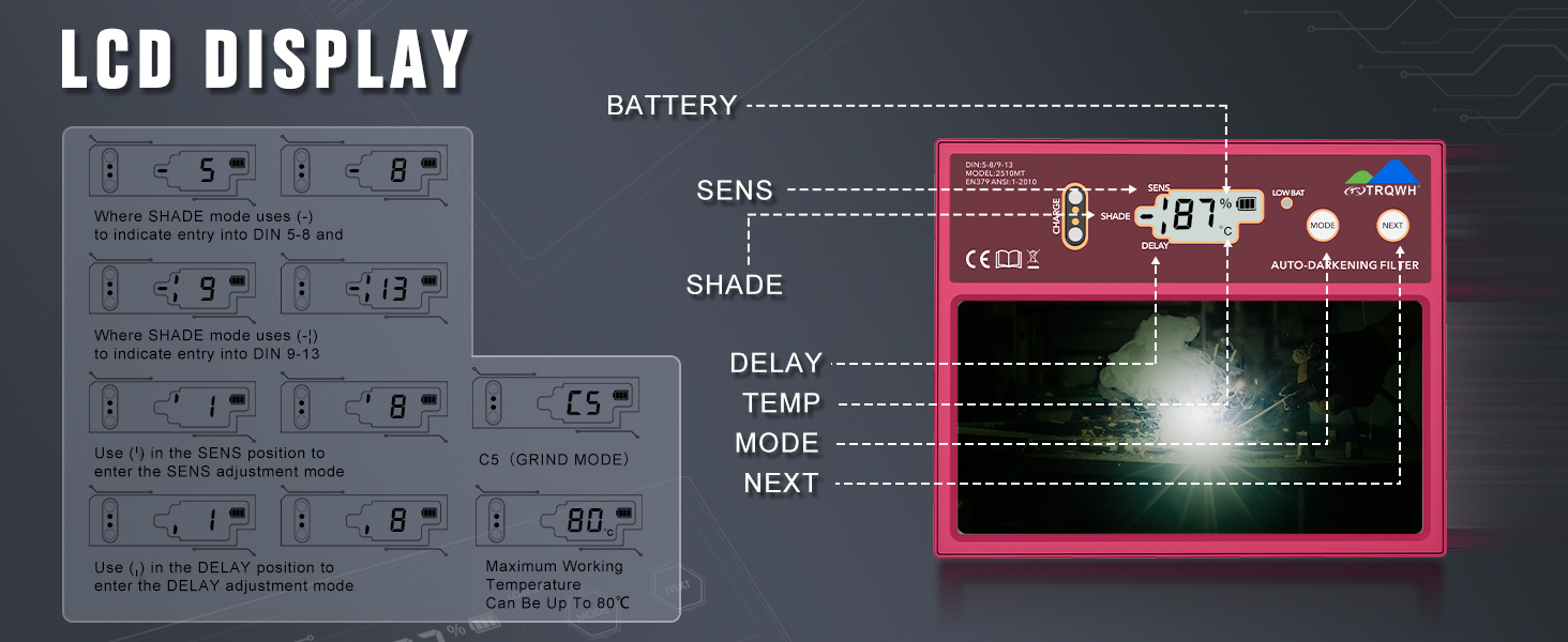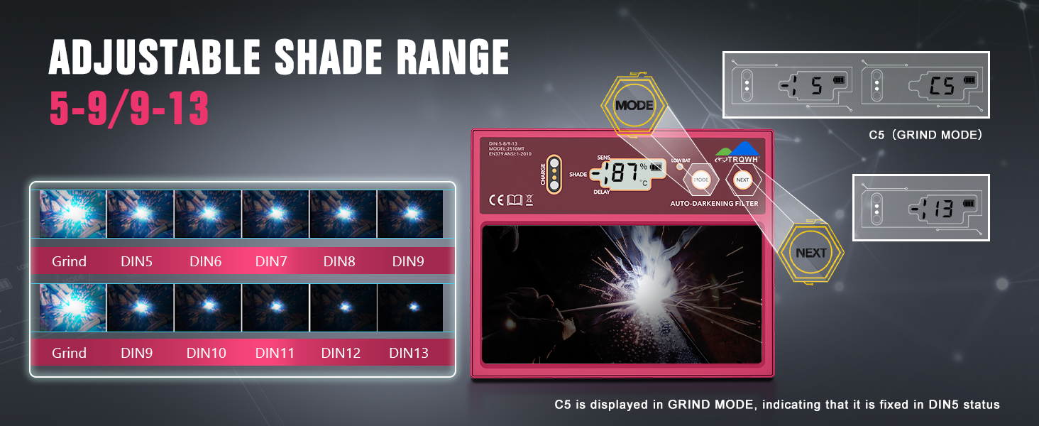 【Digital Display】LCD display and button settings. Press the "Shade" button to choose Welding Mode (Shade 5, Shade 6, Shade 7, Shade 8, Shade 9, Shade 10, Shade 11, Shade 12, Shade 13) and Grinding Mode (C5).
