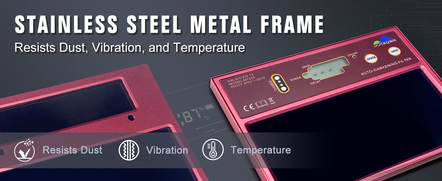 【Metal Frame】The welding lens shell is made of aluminum alloy, which has good toughness, waterproof and high temperature resistance, protects the lens in high amperage applications. The whole lens realizes IP53 grade dustproof and waterproof, and maximum operating temperature of 80°C.