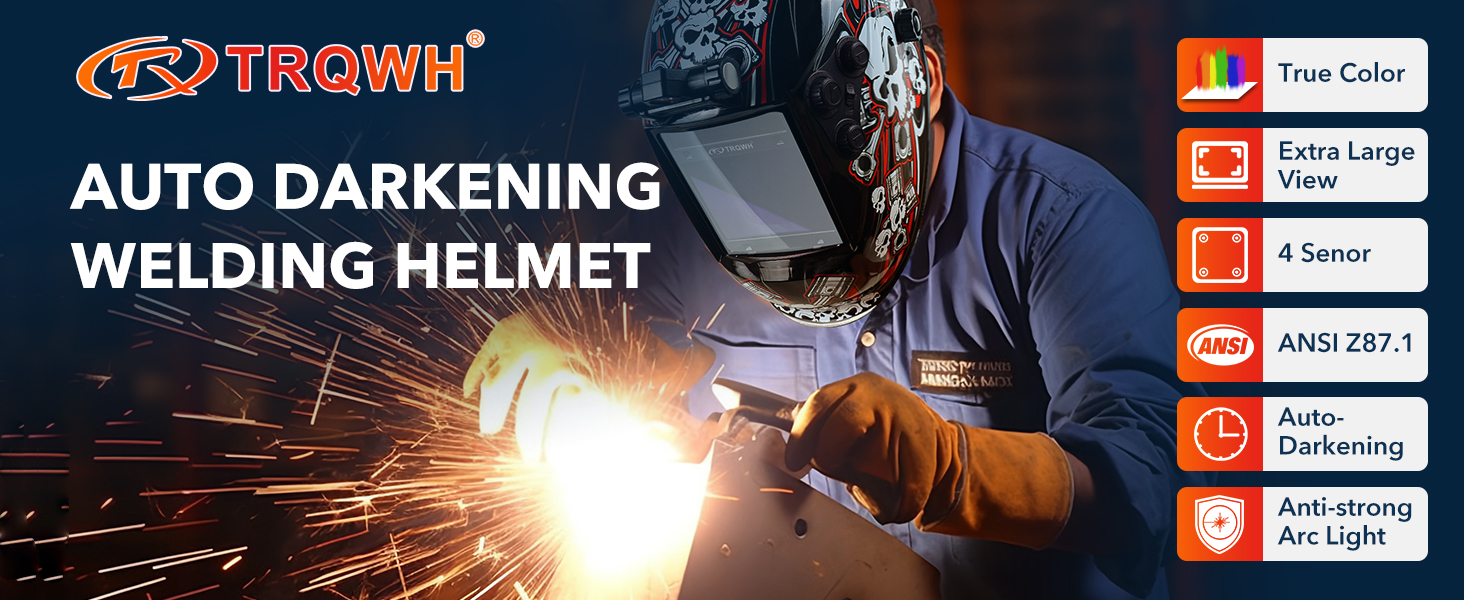 【LARGE VIEW & SUPERIOR CLARITY】TRQWH welding helmet with new true color technology and large viewing. Top 1/1/1/1 optical clarity of the lens, restore every details of working conditions. In addition our this welding helmet is equipped with a USB port on top of the rechargeable LED light, even in the dark environment can also be easily welding