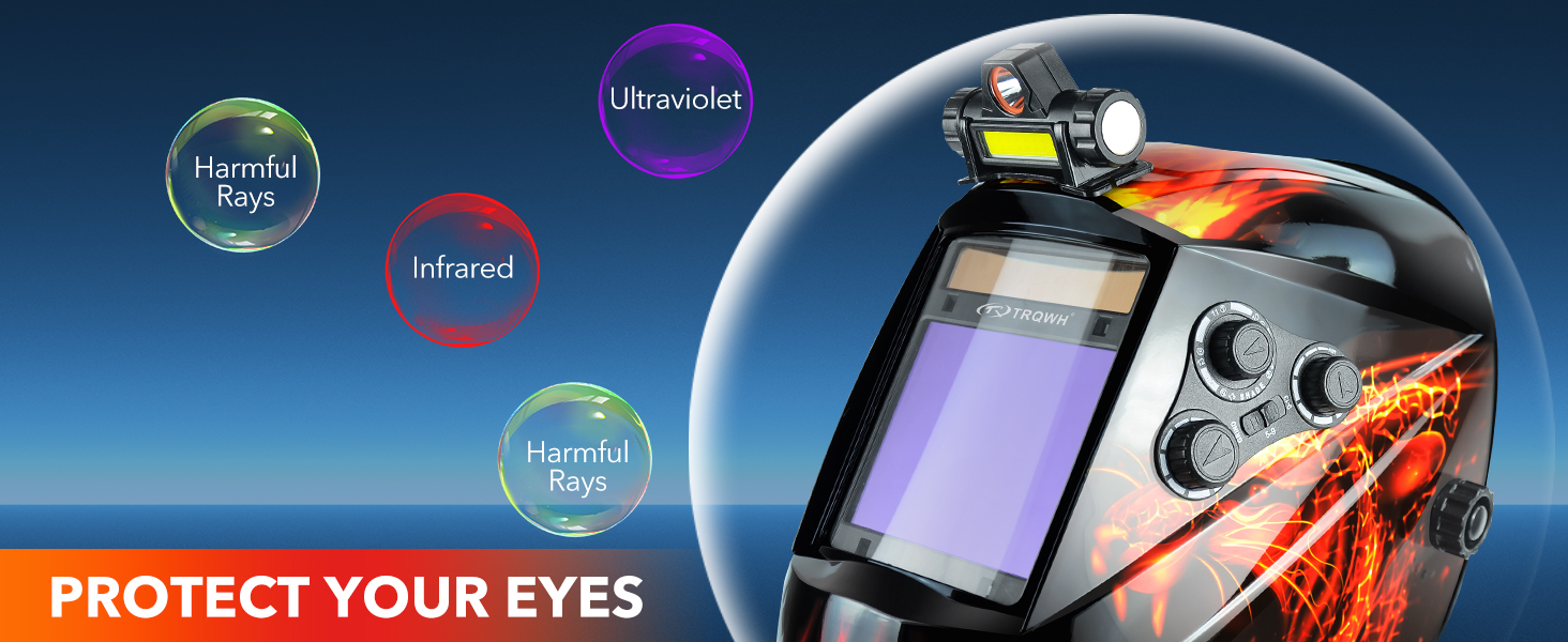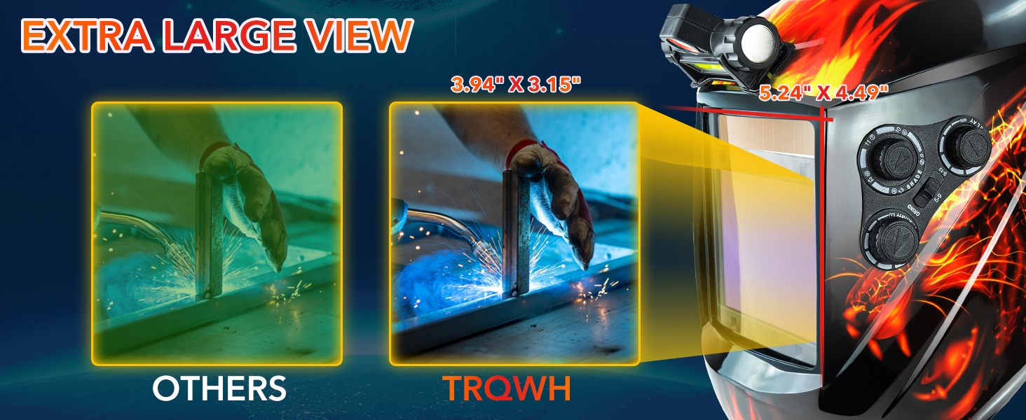 【LARGE VIEW & SUPERIOR CLARITY】TRQWH welding helmet with new true color technology and large viewing. Top 1/1/1/1 optical clarity of the lens, restore every details of working conditions. In addition our this welding helmet is equipped with a USB port on top of the rechargeable LED light, even in the dark environment can also be easily welding