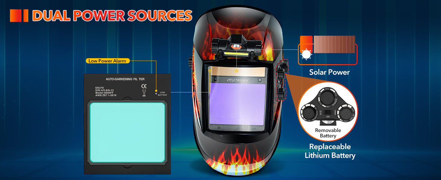 【MULTIPURPOSE WELDER MASK】Our auto darkening welding helmet is made of PP material, solar and replaceable lithium battery dual power sources design, eco-friendly and extending the battery life. The welding helmet can be widely used to cope with plasma cutting, abrasive cutting/grinding, DC TIG, AC TIG, MIG/MAG, MMA/stick welding, and other workplaces