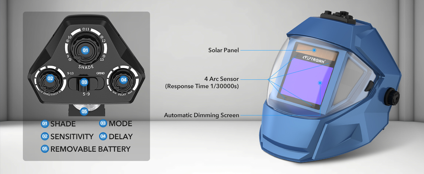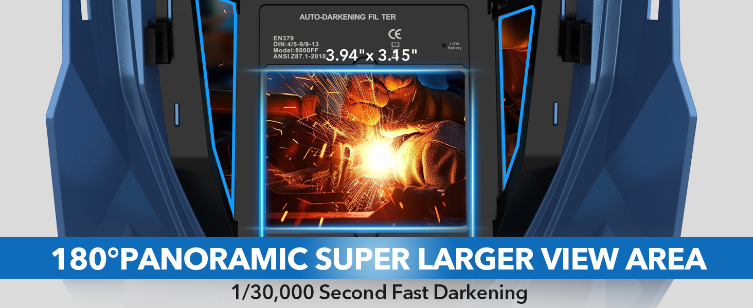 【180° LARGE VIEW & SUPERIOR CLARITY】TRQWH panoramic 180° large viewing welding helmet with new true color technology and large viewing screen with side view. Top 1/1/1/1 optical clarity of the lens, restore every details of working conditions. Creates a wide field of view, allowing the welder to have a higher field of vision and comfort