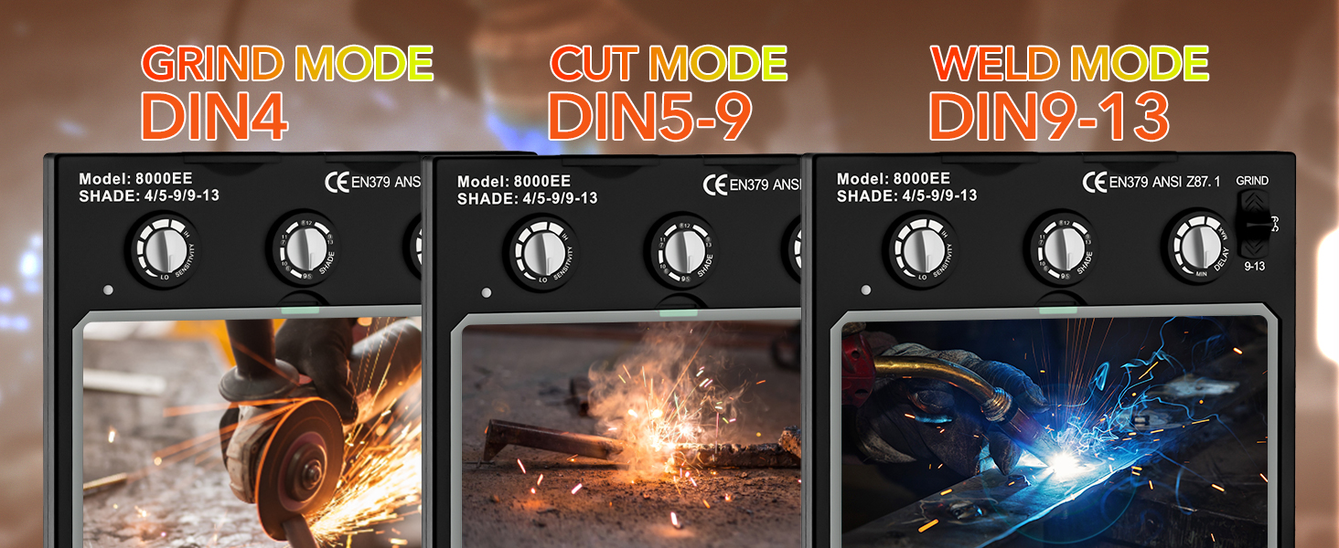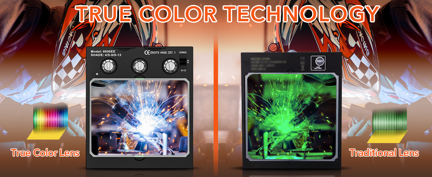 【Long-lasting and durable welding helmet】This auto darkening welding helmet is made of high-quality PP material, which is impact-resistant, flame-resistant and tough. The welder helmet complies with ANSI Z87.1/ EN379 CE/ CSA Z94.3 standards. This true color welding helmet uses solar cells and CR2450 replaceable lithium batteries. The solar cells can absorb the strong light energy caused by the electric arc, thus extending the battery life. The lithium battery is replaceable.