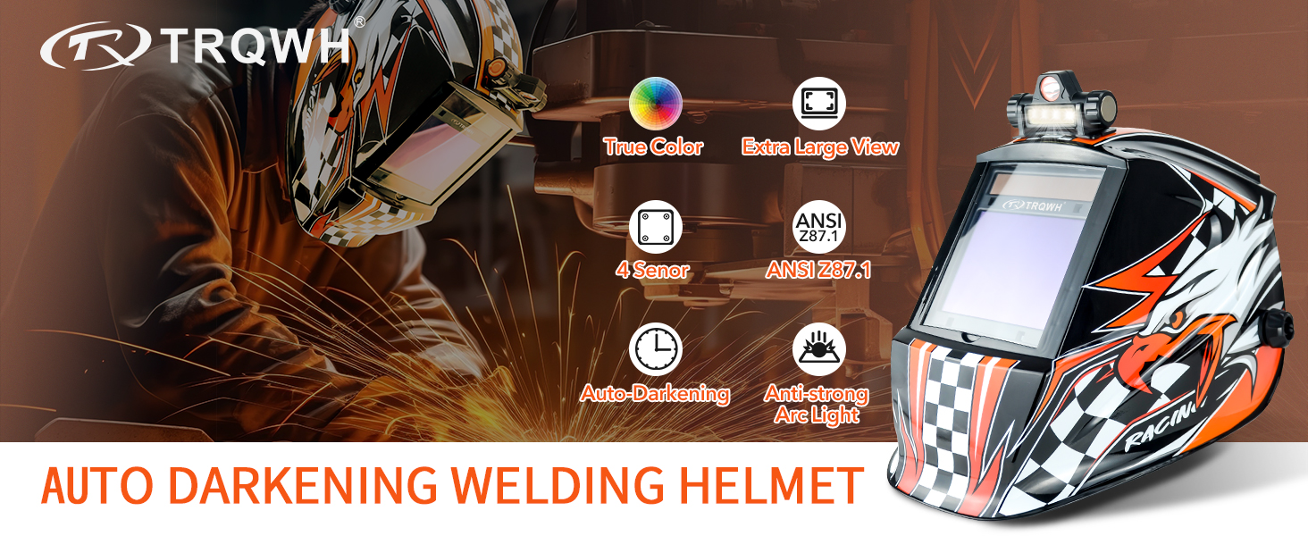 High performance for TRQWH welding helmet, true color technology; fast auto darkening 1/30000s switching time; and stepless control for sensitivity, shade and delay.