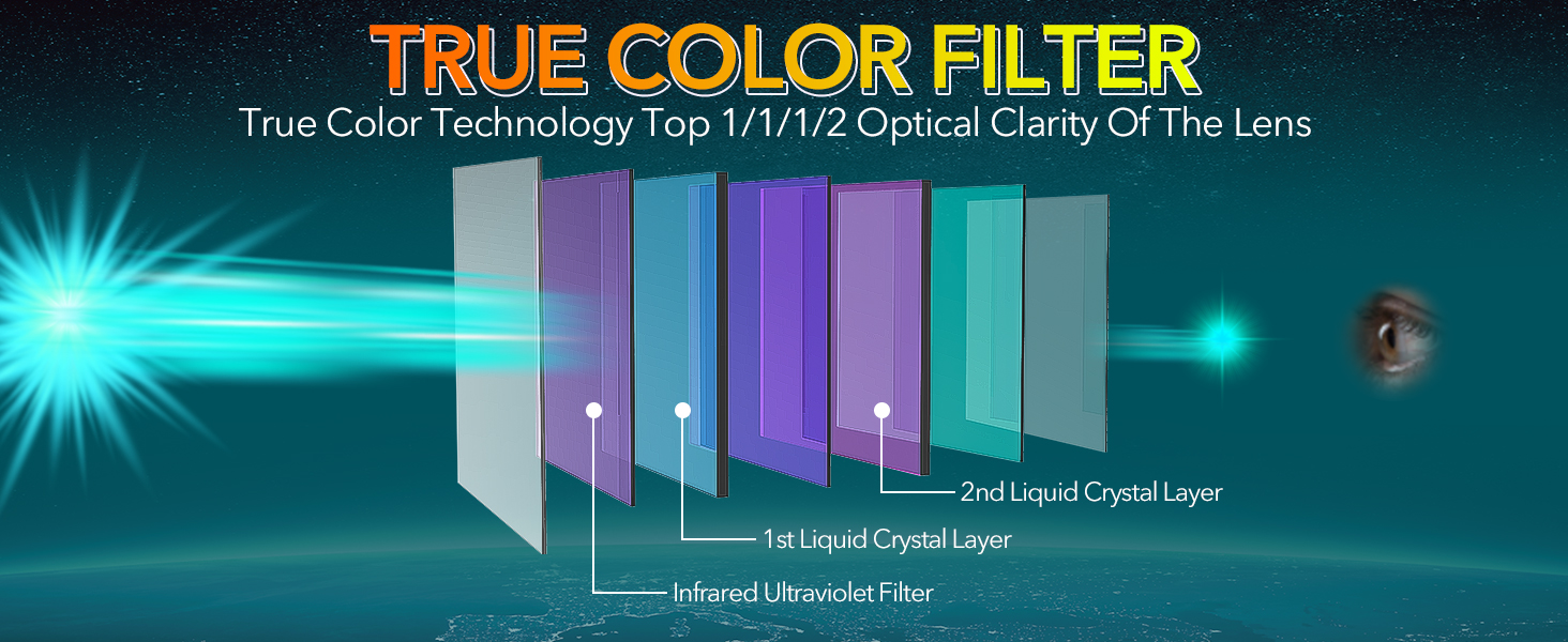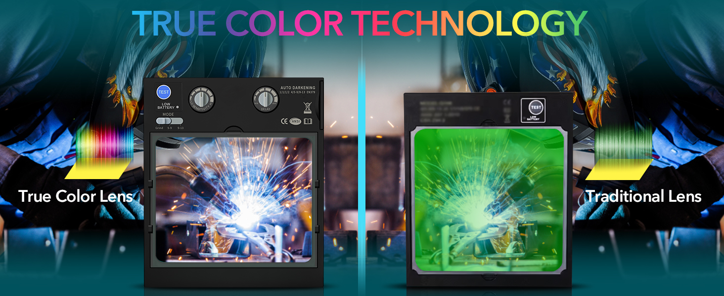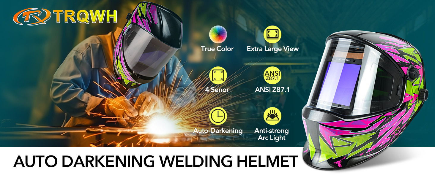 TRQWH auto darkening welding helmet with True Color technology , 1-1-1-2 optical clarity. And technical standard of EN379 and ANSI Z87.1. Switching from light to dark in 1/25000 sec.