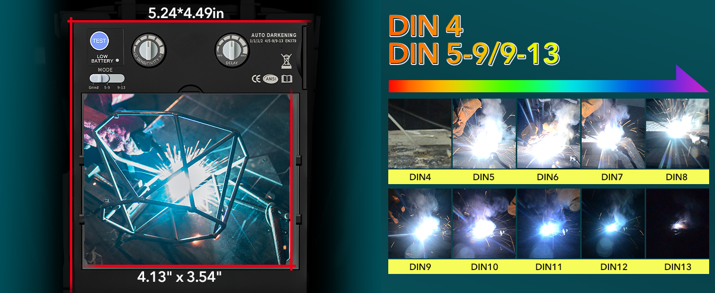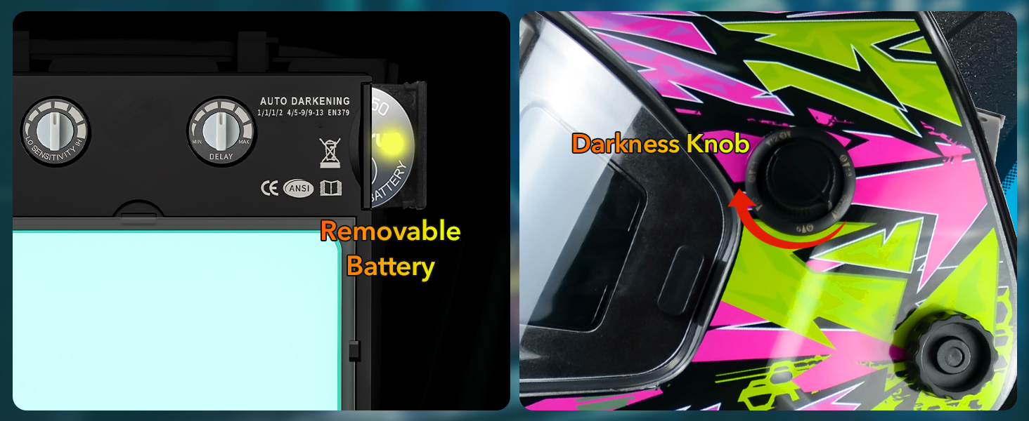 【Long-lasting and durable welding helmet】This auto darkening welding helmet is made of high-quality PP material, which is impact-resistant, flame-resistant and tough. The welder helmet complies with ANSI Z87.1/ EN379 CE/ CSA Z94.3 standards. This true color welding helmet uses solar cells and CR2450 replaceable lithium batteries. The solar cells can absorb the strong light energy caused by the electric arc, thus extending the battery life. The lithium battery is replaceable.