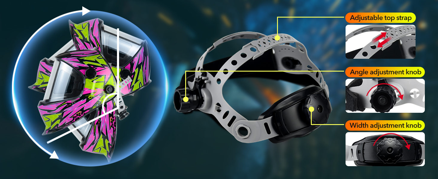 Headgear is easy to adjust while weld working. The width, depth and angle of the headgear can be adjusted, please follow your own head to adjust to the appropriate range.
