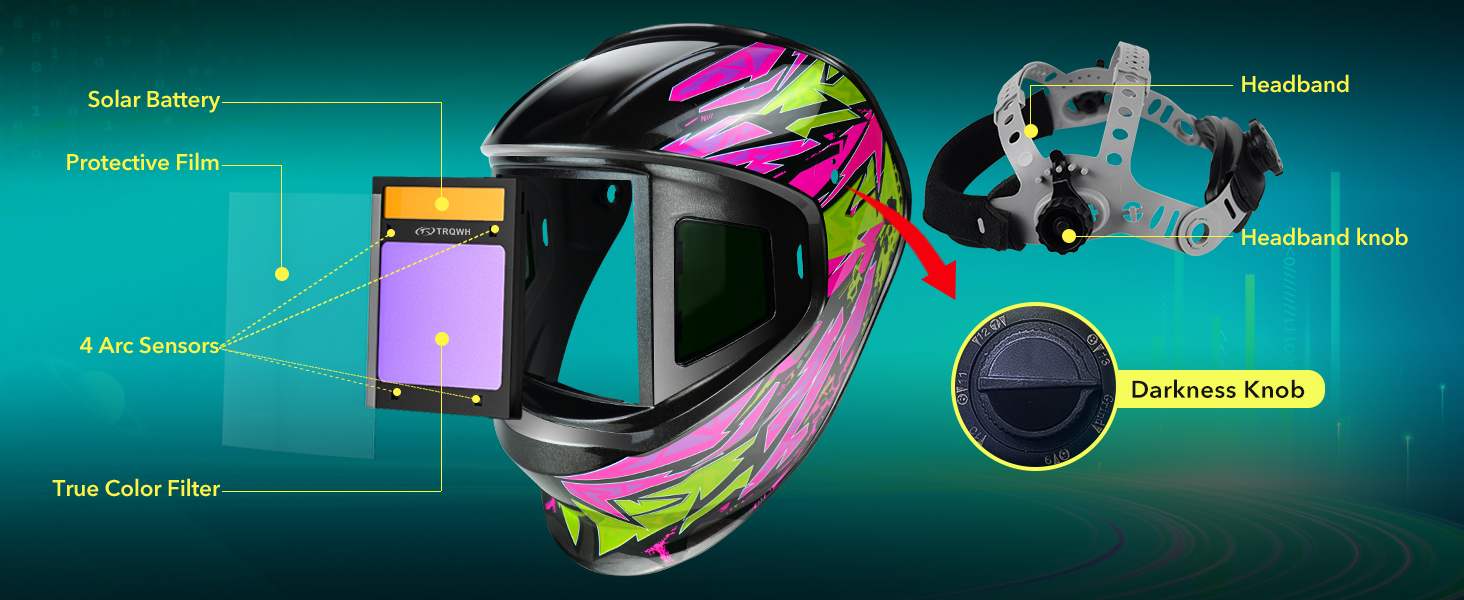 High performance for TRQWH welding helmet, true color technology; fast auto darkening 1/25000s switching time; and stepless control for sensitivity, shade and delay.