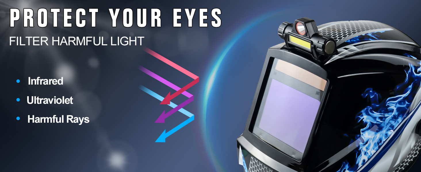Solar-powered welding helmet with auto-darkening filter. It can quickly block the harmful light,and effectively protect the face of welders from injury.