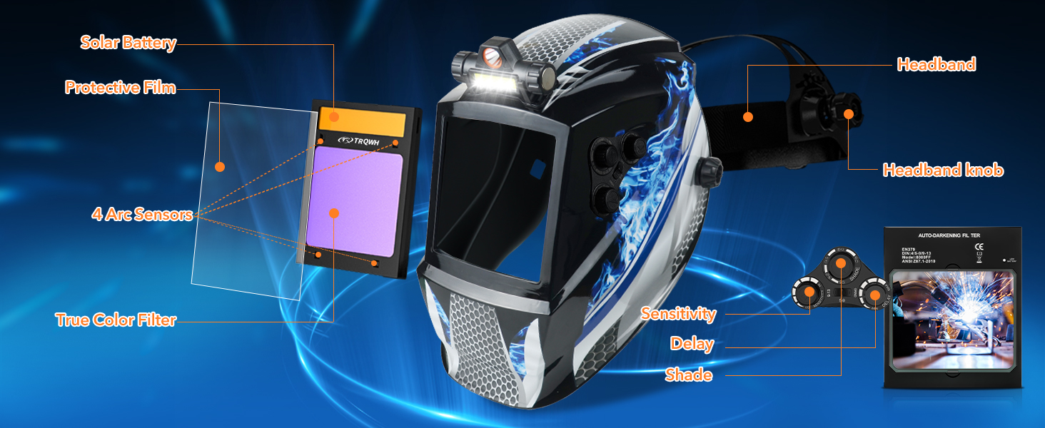 High performance for TRQWH welding helmet, true color technology; fast auto darkening 1/30000s switching time; and stepless control for sensitivity, shade and delay.