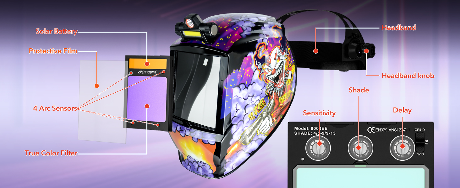 High performance for TRQWH welding helmet, true color technology; fast auto darkening 1/30000s switching time; and stepless control for sensitivity, shade and delay.