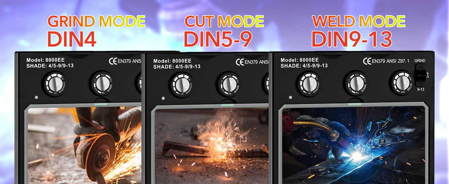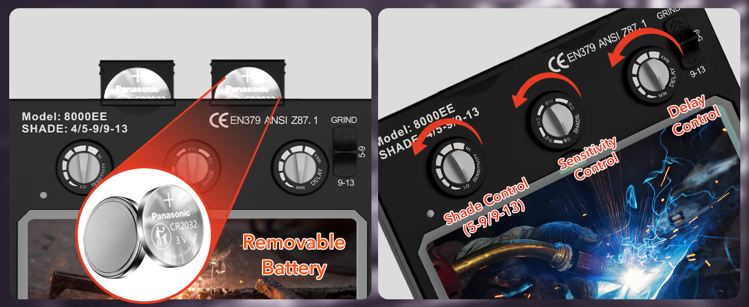【Long-lasting and durable welding helmet】This auto darkening welding helmet is made of high-quality PP material, which is impact-resistant, flame-resistant and tough. The welder helmet complies with ANSI Z87.1/ EN379 CE/ CSA Z94.3 standards. This true color welding helmet uses solar cells and CR2450 replaceable lithium batteries. The solar cells can absorb the strong light energy caused by the electric arc, thus extending the battery life. The lithium battery is replaceable.