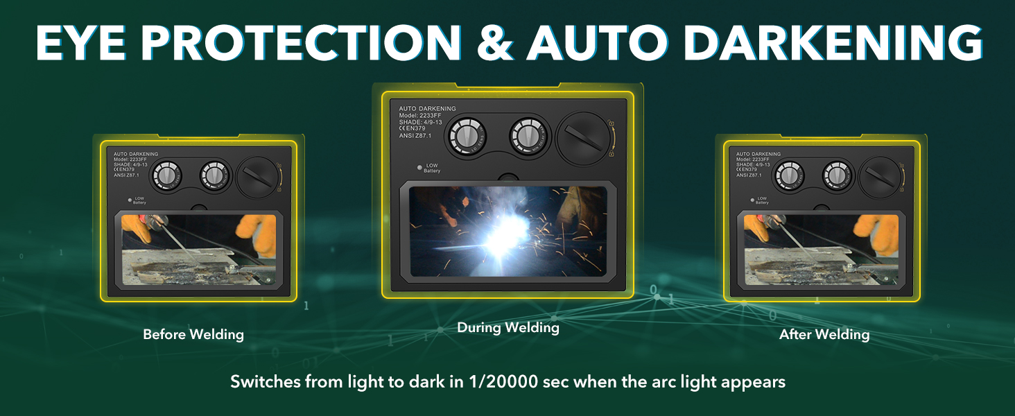 【Ultimate Eye Protection Welding Helmet】Come with high-end auto-darkening lens, that switches from light to dark in 1/20000 sec when the arc light appears. The lens is made of high-quality double liquid crystal layers and optical coating filter, which can resist 99% of the harmful light to the eyes. Meets ANSI Z87.1/ EN379 CE/ CSA Z94.3 standards
