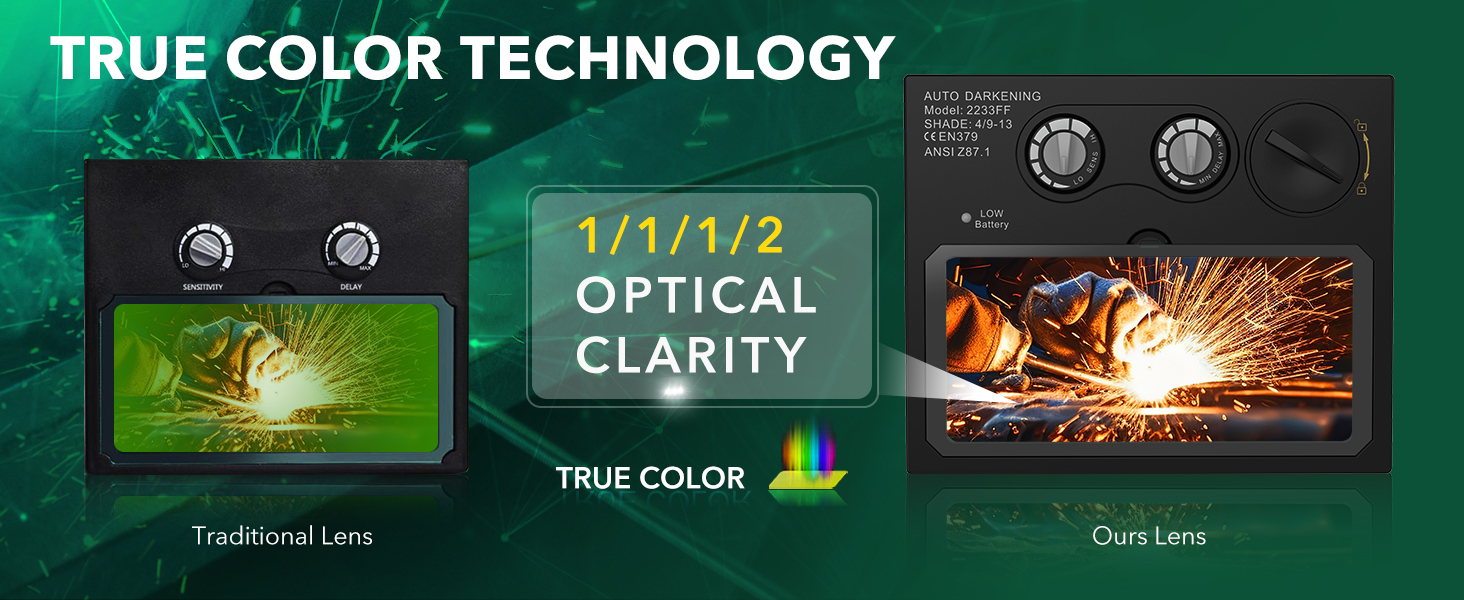 TRQWH auto darkening welding helmet with LED light. The welding hood with newly upgraded true color technology , 1-1-1-2 optical clarity rating restore every details of working conditions, improved visibility and reduced your eye strain.