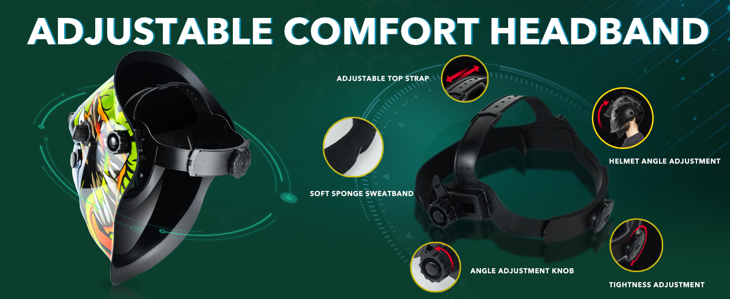 【Comfort Durable Welding Mask】Balanced with an adjustable and comfortable headgear. Ergonomically welding helmet makes it comfortable and easy to wear. Thickened sponge forehead will protect you from injury. The knobs on both sides can adjust the angle, and the knob at the back can adjust the tightness of the headband, suitable for people with different head circumference