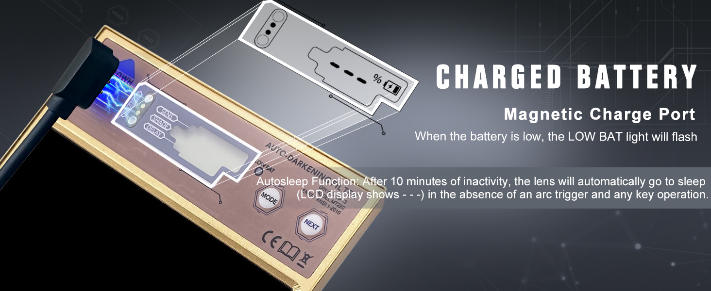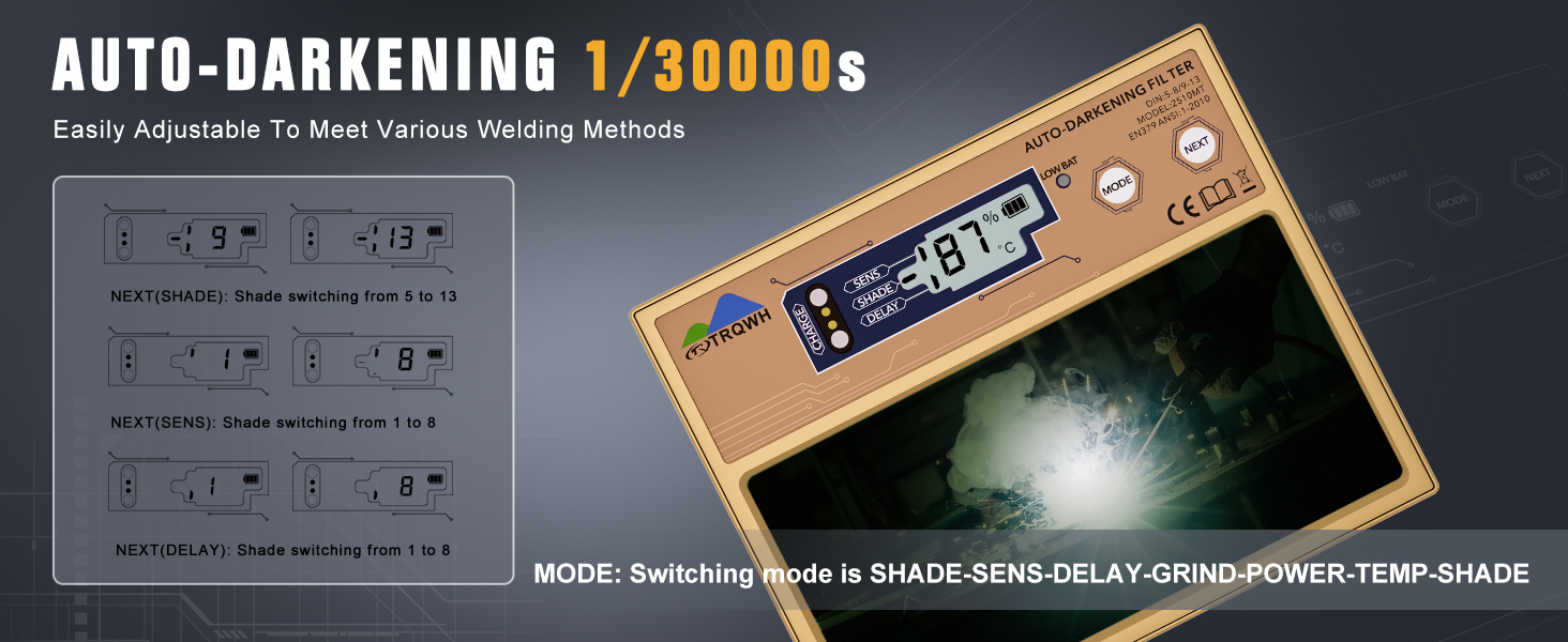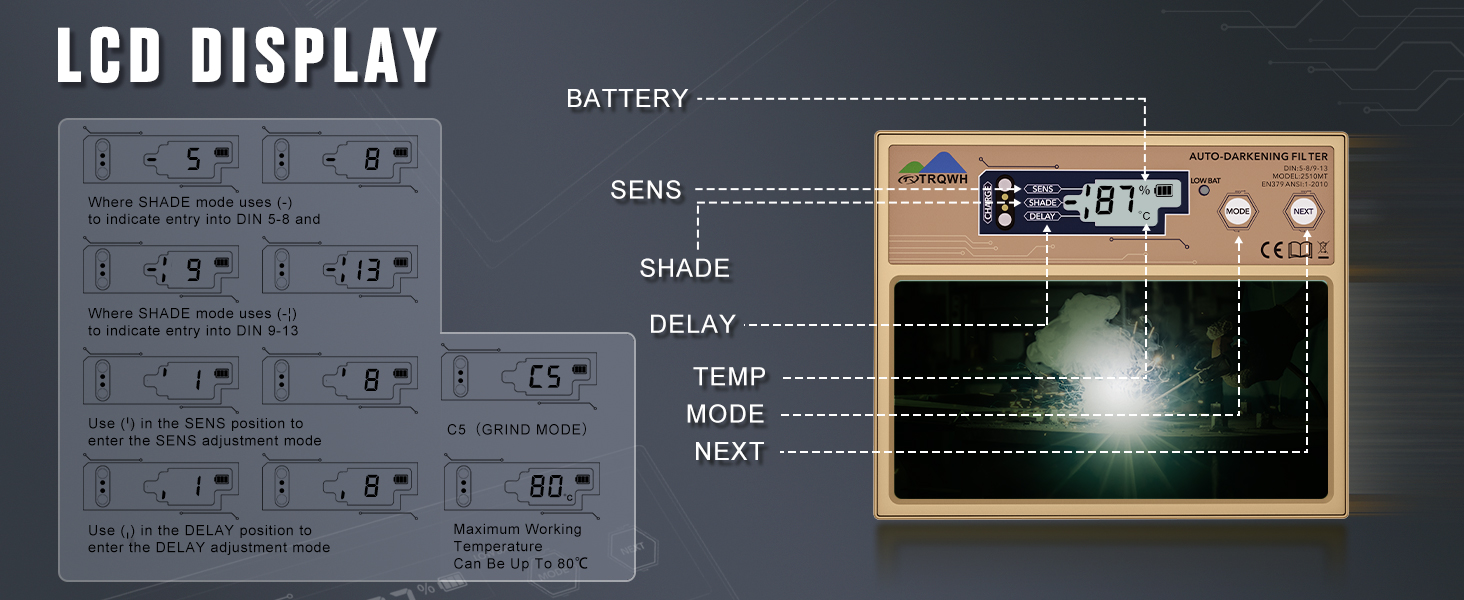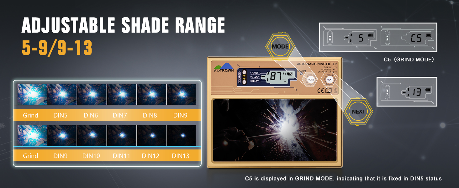- 【Digital Display】LCD display and button settings. Press the "Shade" button to choose Welding Mode (Shade 5, Shade 6, Shade 7, Shade 8, Shade 9, Shade 10, Shade 11, Shade 12, Shade 13) and Grinding Mode (C5).