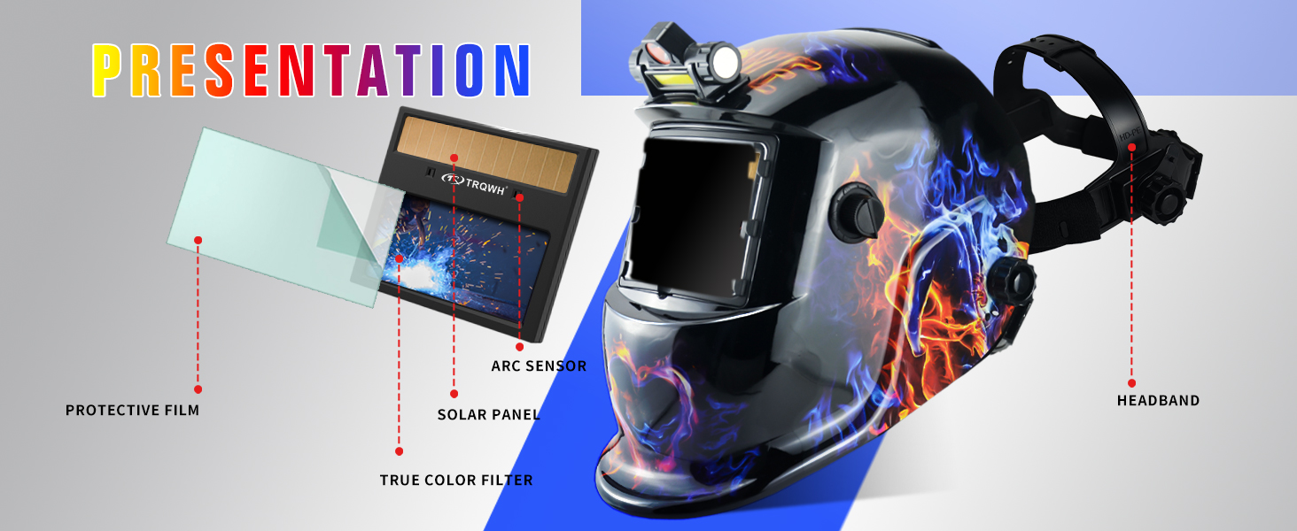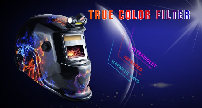 TRQWH auto darkening welding helmet with True Color technology , 1-1-1-2 optical clarity. And technical standard of EN379 and ANSI Z87.1. Switching from light to dark in 1/20000 sec.