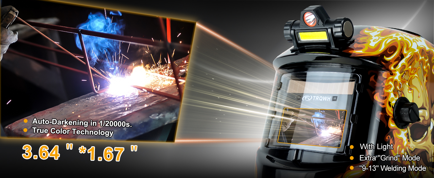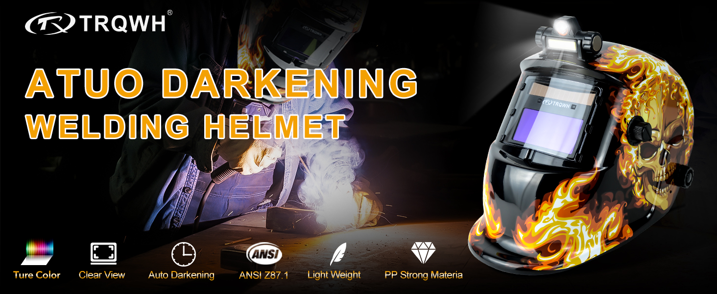 TRQWH auto darkening welding helmet with LED light. The welding hood with newly upgraded true color technology , 1-1-1-2 optical clarity rating restore every details of working conditions, improved visibility and reduced your eye strain. And technical standard of EN379 and ANSI Z87.1.
