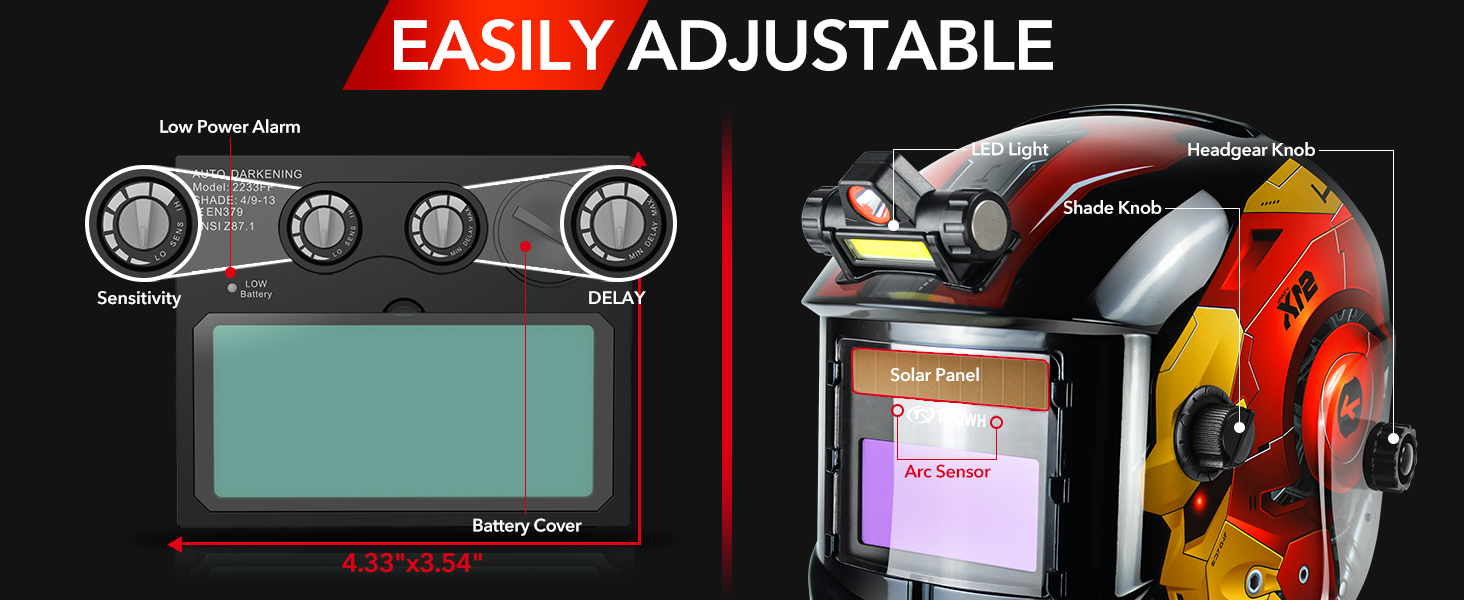 【Adjustable Sensitive & Delay】Equipped with delay and sensitivity setting knobs on the outside of the welding hood to suit different environments and tasks. Light level of the filter is DIN4 and the time from dark to bright state is within 0.2s to 1.0s (delay settings). And with external grind button allows you to quickly switch between weld and grind modes without having to remove the helmet.