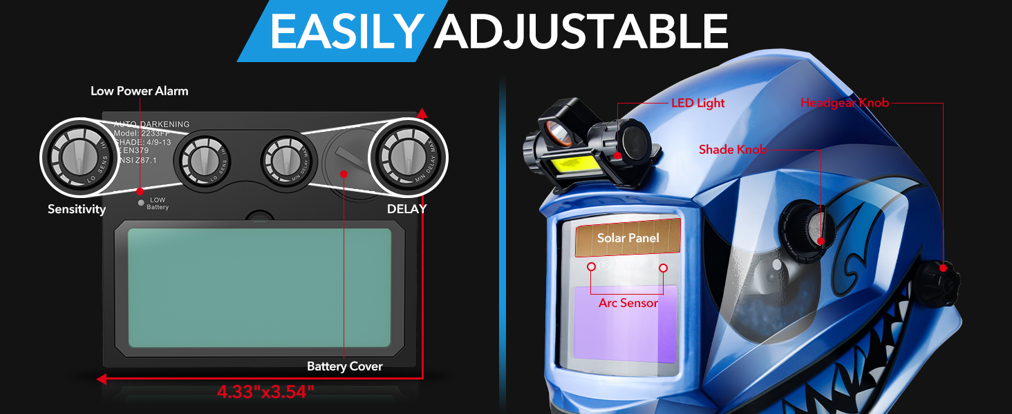 【Adjustable Sensitive & Delay】Equipped with delay and sensitivity setting knobs on the outside of the welding hood to suit different environments and tasks. Light level of the filter is DIN4 and the time from dark to bright state is within 0.2s to 1.0s (delay settings). And with external grind button allows you to quickly switch between weld and grind modes without having to remove the helmet.