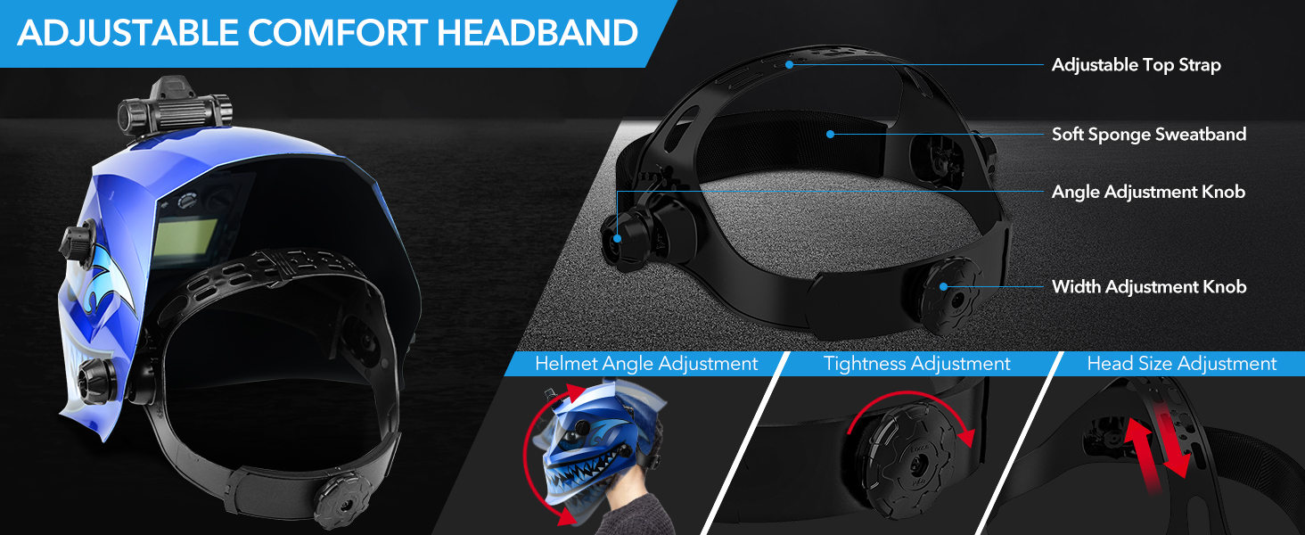 【Comfort Durable Welding Mask】Balanced with an adjustable and fatigue-free comfortable headgear. Ergonomically welding helmet makes it comfortable and easy to wear. Thickened sponge forehead will protect you from injury. The knobs on both sides can adjust the angle, and the knob at the back can adjust the tightness of the headband, suitable for people with different head circumference.
