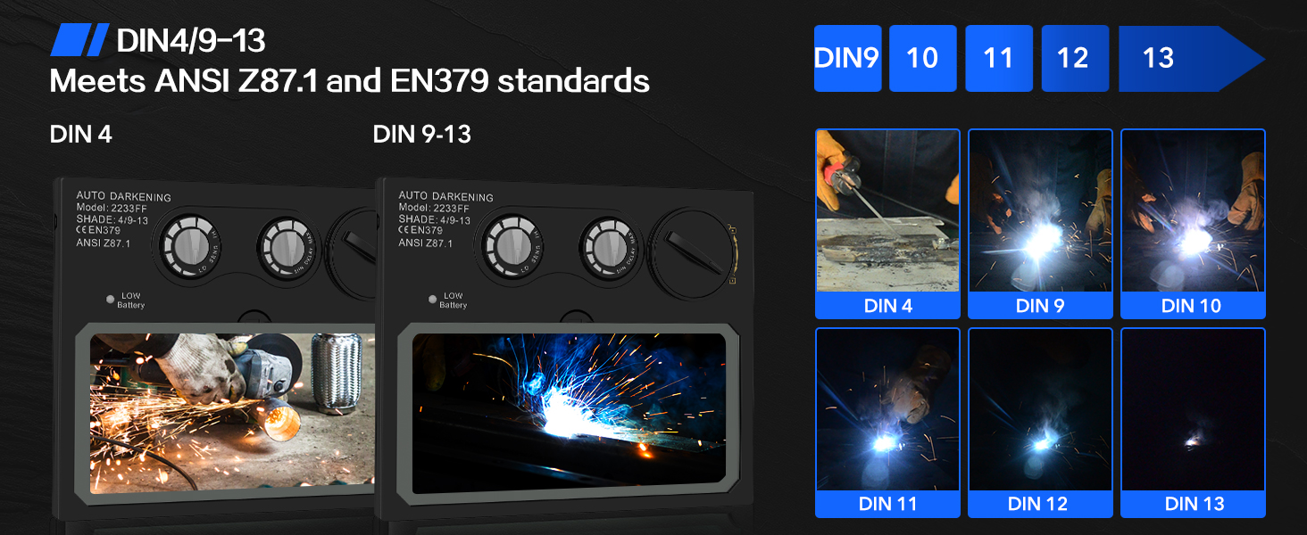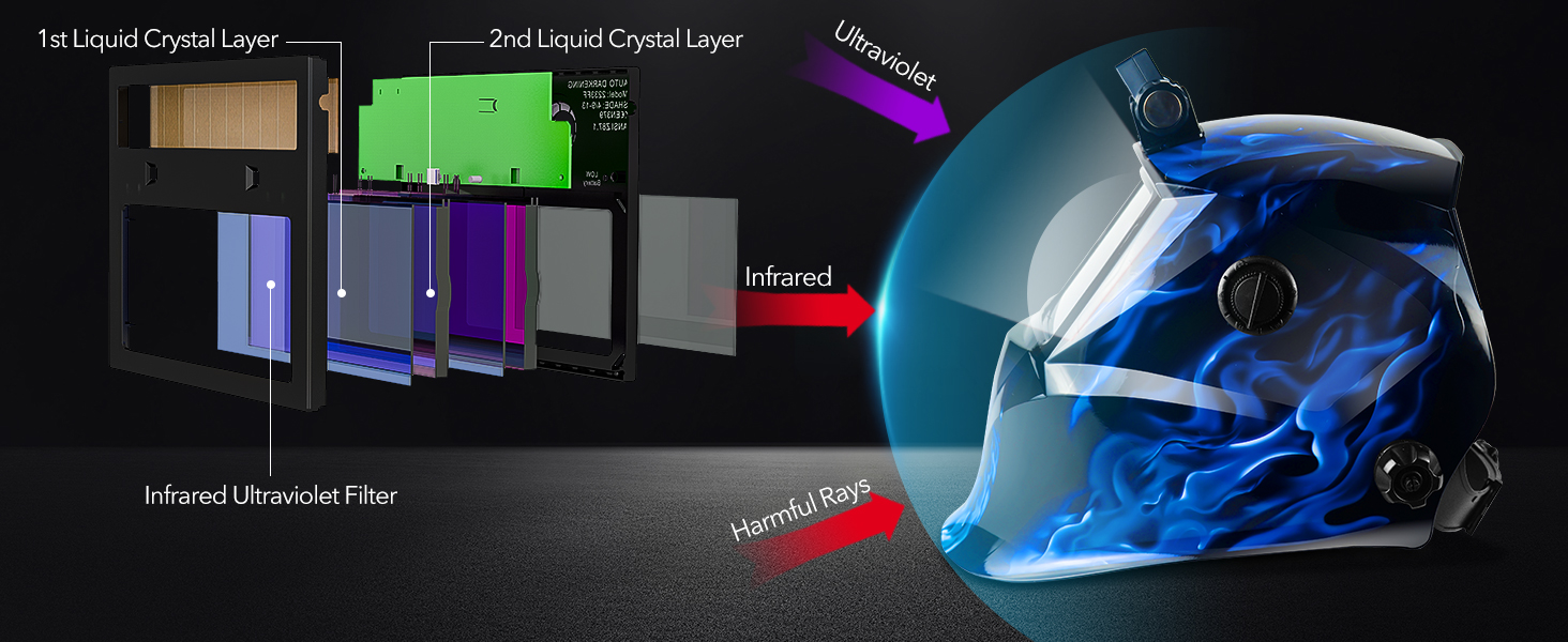 【Ultimate Eye Protection Welding Helmet】Come with high-end auto-darkening lens, that switches from light to dark in 1/20000 sec when the arc light appears. The lens is made of high-quality double liquid crystal layers and optical coating filter, which can resist 99% of the harmful light to the eyes. Meets ANSI Z87.1/ EN379 CE/ CSA Z94.3 standards.