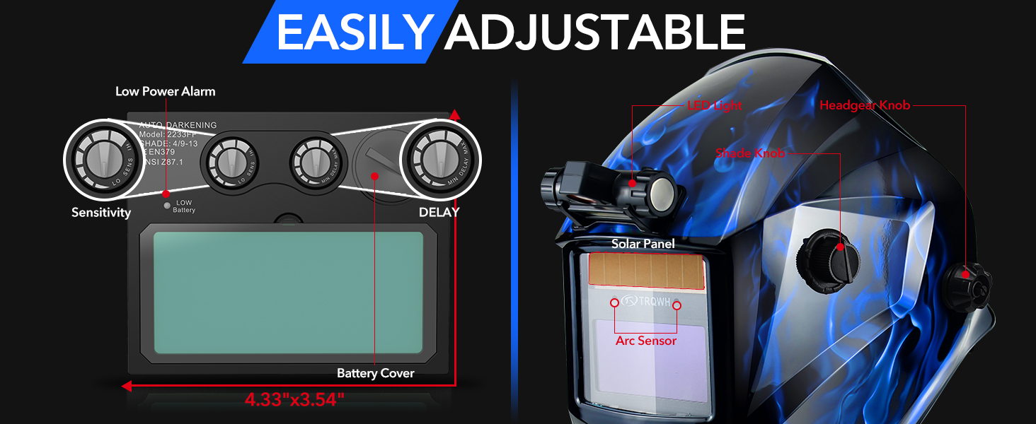 【Adjustable Sensitive & Delay】Equipped with delay and sensitivity setting knobs on the outside of the welding hood to suit different environments and tasks. Light level of the filter is DIN4 and the time from dark to bright state is within 0.2s to 1.0s (delay settings). And with external grind button allows you to quickly switch between weld and grind modes without having to remove the helmet.