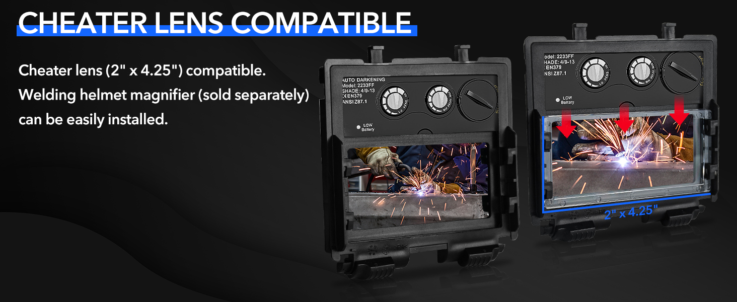 Cheater lens (2"x 4.25") compatible. Enlarge the objects being viewed through the welding helmet's protective window, improved visibility and reduced your eye strain.