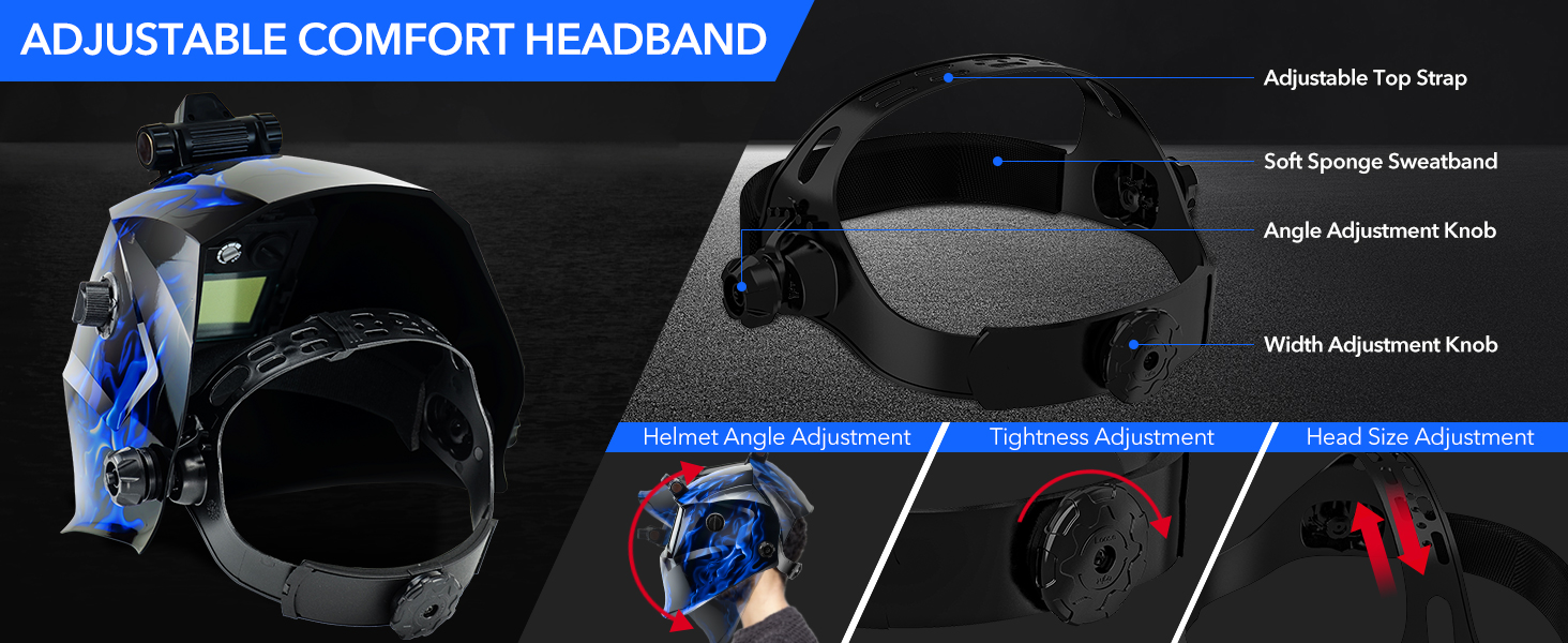 【Comfort Durable Welding Mask】Balanced with an adjustable and fatigue-free comfortable headgear. Ergonomically welding helmet makes it comfortable and easy to wear. Thickened sponge forehead will protect you from injury. The knobs on both sides can adjust the angle, and the knob at the back can adjust the tightness of the headband, suitable for people with different head circumference.