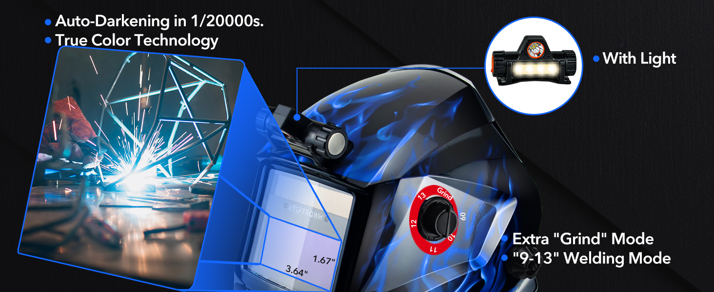 TRQWH auto darkening welding helmet with LED light. The welding hood with newly upgraded true color technology , 1-1-1-2 optical clarity rating restore every details of working conditions, improved visibility and reduced your eye strain. And technical standard of EN379 and ANSI Z87.1.