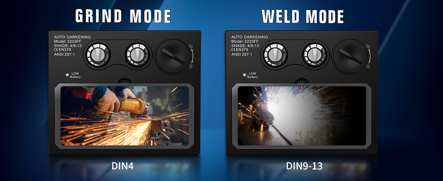【Adjustable Sensitive & Delay】Equipped with delay and sensitivity setting knobs on the outside of the welding hood to suit different environments and tasks. Light level of the filter is DIN4 and the time from dark to bright state is within 0.2s to 1.0s (delay settings). And with external grind button allows you to quickly switch between weld and grind modes without having to remove the helmet.