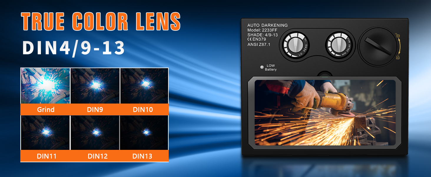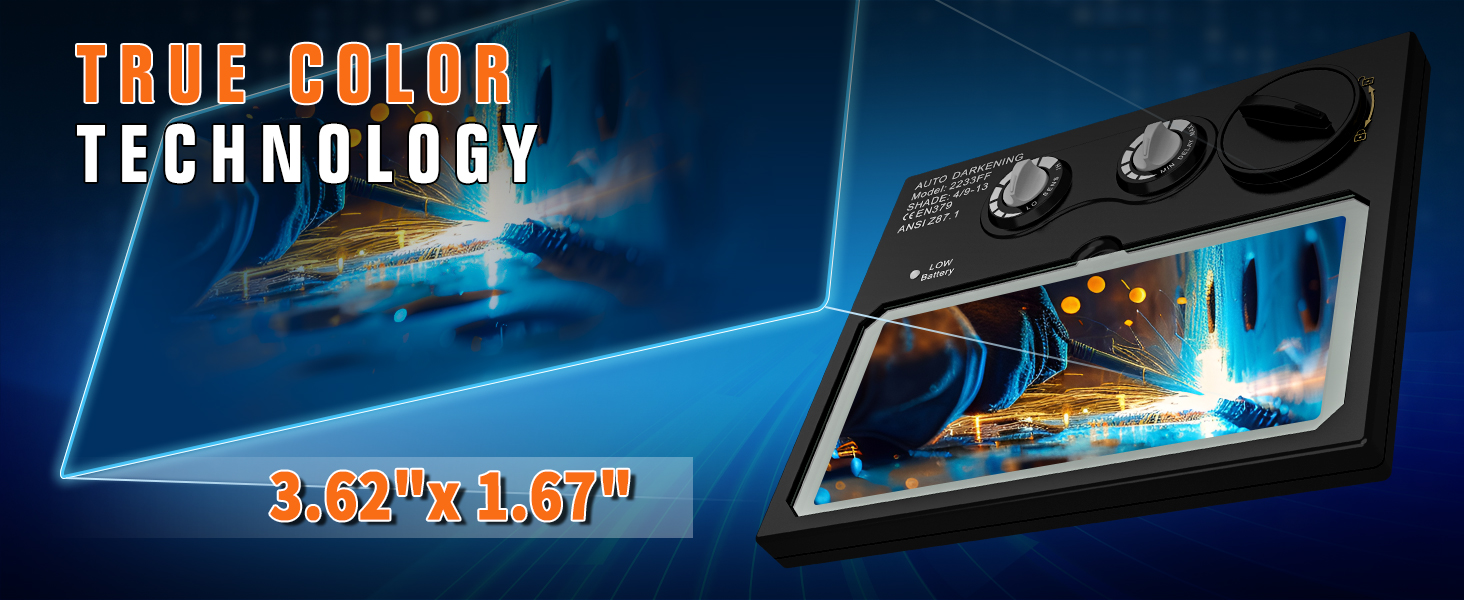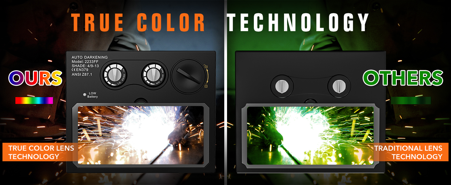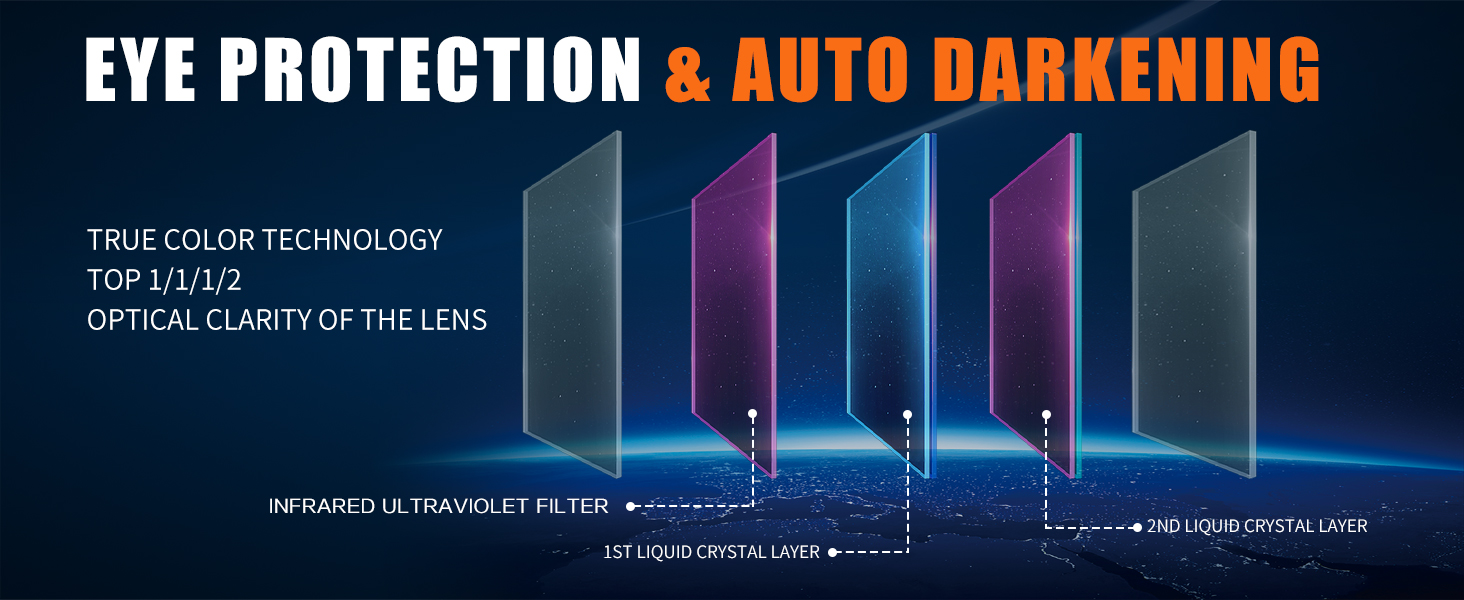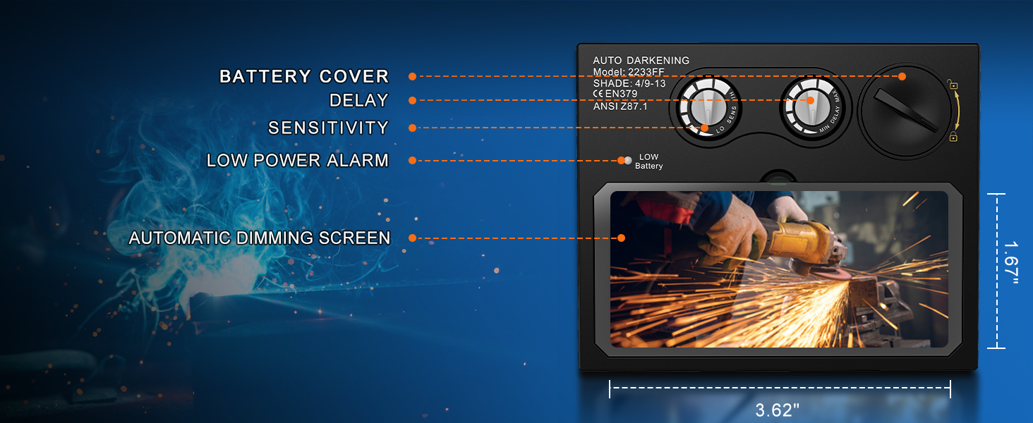 【Ultimate Eye Protection Welding Helmet】Come with high-end auto-darkening lens, that switches from light to dark in 1/20000 sec when the arc light appears. The lens is made of high-quality double liquid crystal layers and optical coating filter, which can resist 99% of the harmful light to the eyes. Meets ANSI Z87.1/ EN379 CE/ CSA Z94.3 standards.