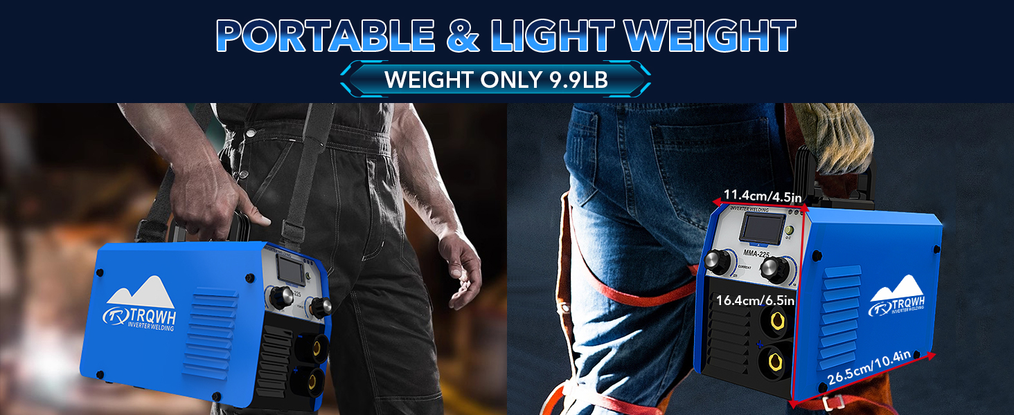 ★【Portable Welder Machine】TRQWH ARC welder is made of high quality material, compact mini body design (10.44.56.5in, 4.5kg), easy to move and store. Simple carry handle and adjustable shoulder design make it easy to carry the welder anywhere, convenient for welding indoors and outdoors. This TIG/MIG welder also features high power (225A) and high energy efficiency, so you won't feel fatigue even after long hours of work. Ideal for beginners or professionals for small welding operations