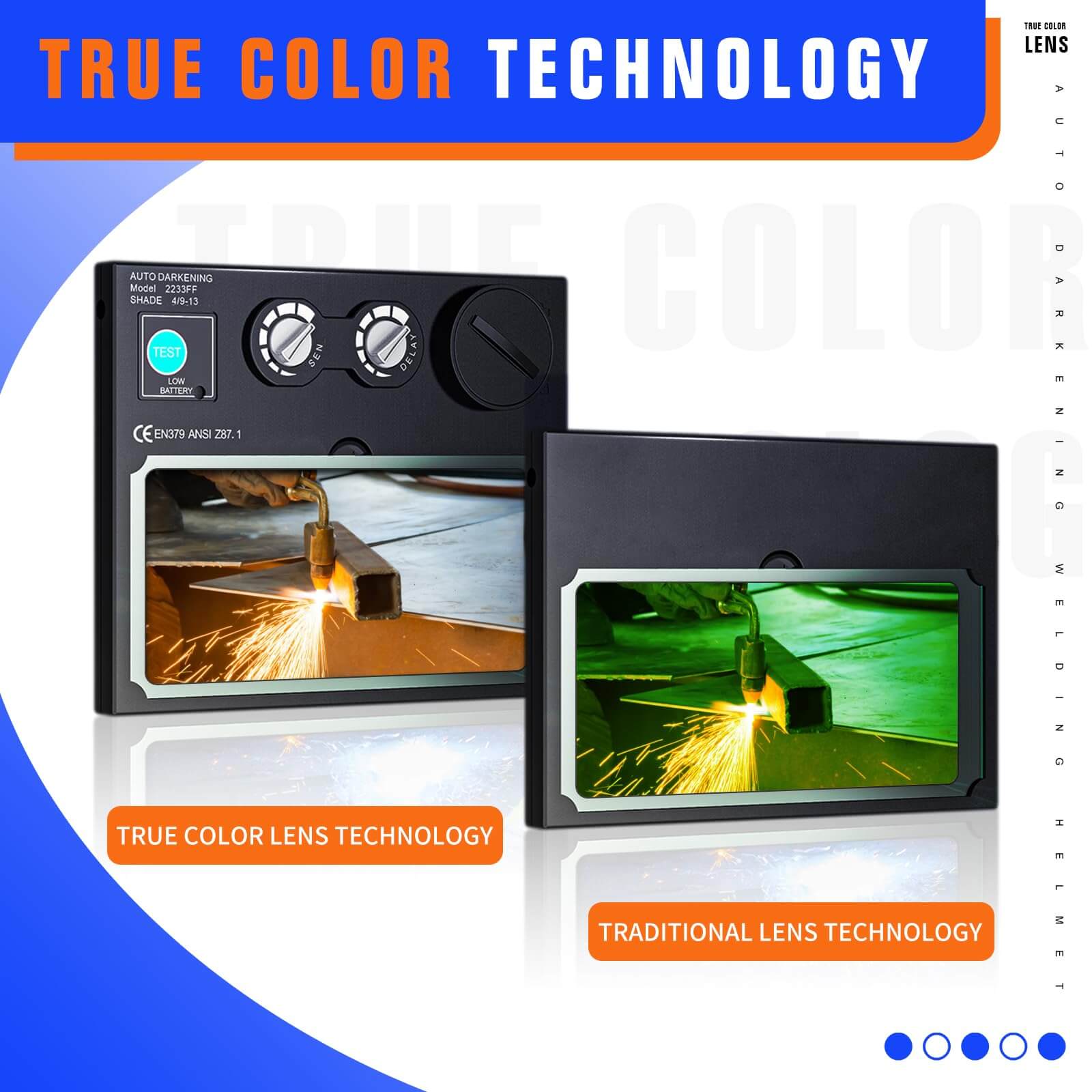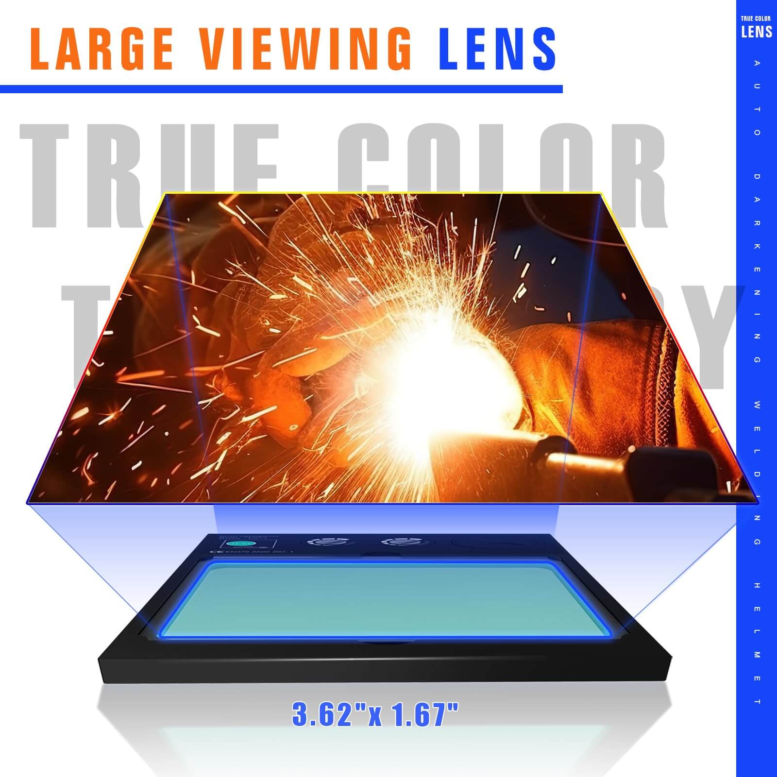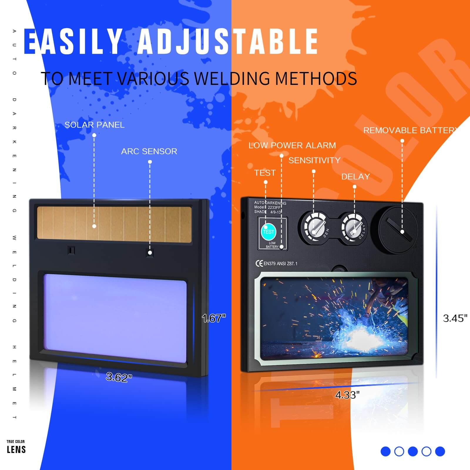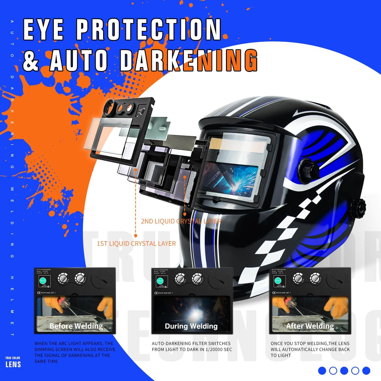【Ultimate Eye Protection Welding Helmet】Come with high-end auto-darkening lens, that switches from light to dark in 1/20000 sec when the arc light appears. The lens is made of high-quality double liquid crystal layers and optical coating filter, which can resist 99% of the harmful light to the eyes. Meets ANSI Z87.1/ EN379 CE/ CSA Z94.3 standards.