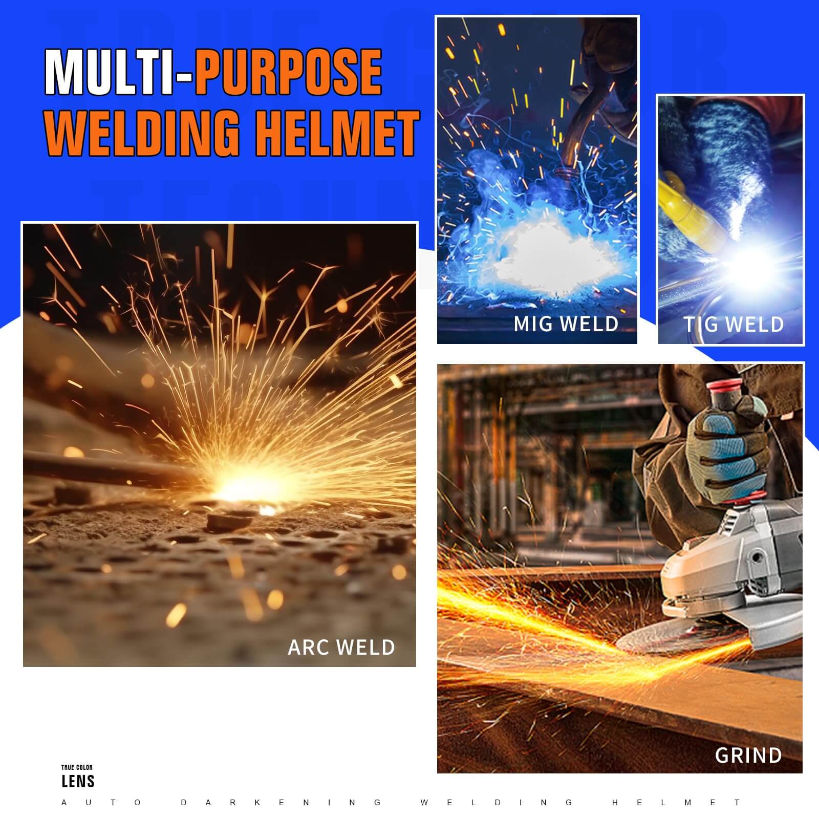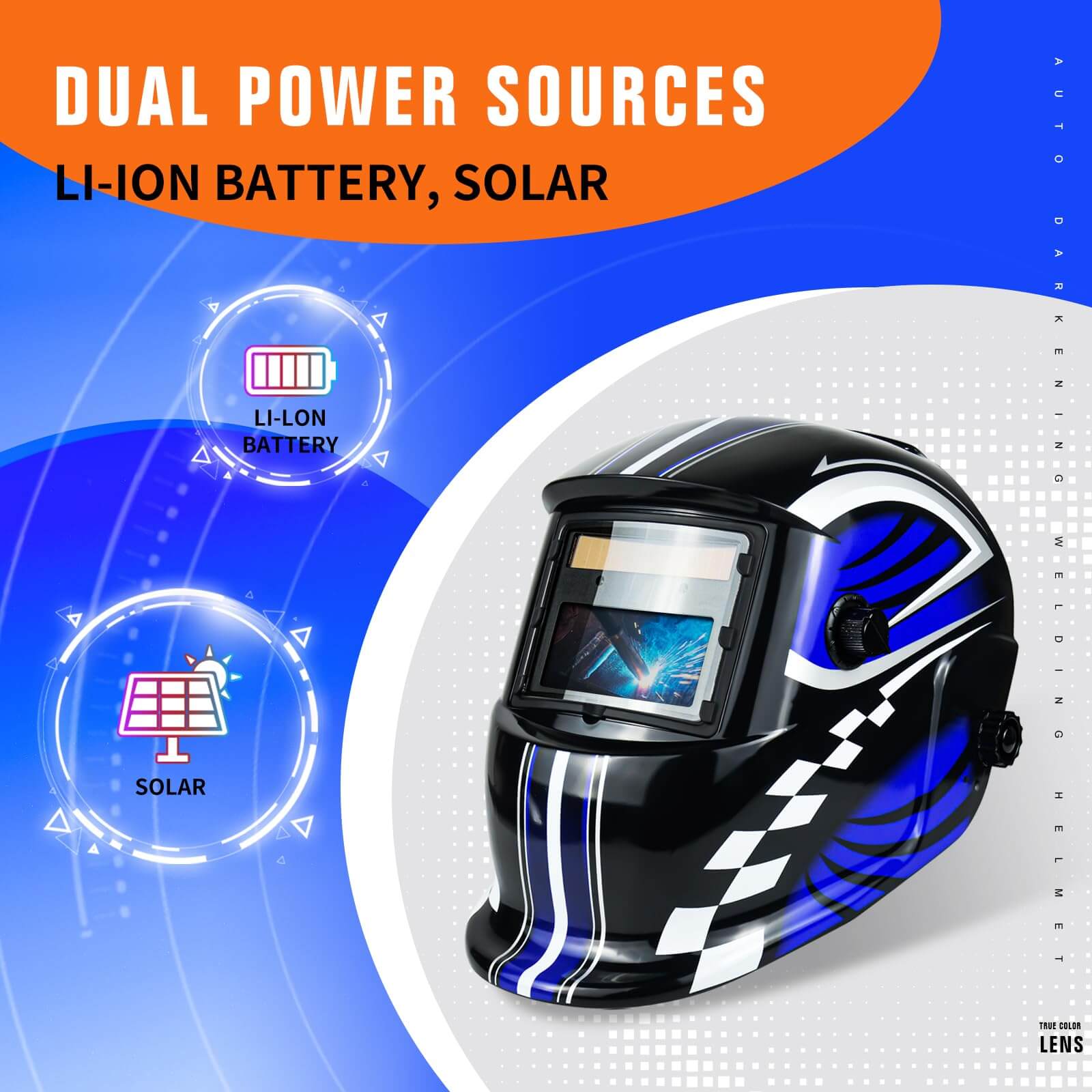 【Multipurpose Welder Mask】Our auto darkening welding helmet is made of high-quality PP material, solar and replaceable lithium battery dual power sources design, eco-friendly and extending the battery life. The welding helmet can be widely used to cope with plasma cutting, abrasive cutting/grinding, DC TIG, AC TIG, MIG/MAG, MMA/stick welding, and other workplaces.