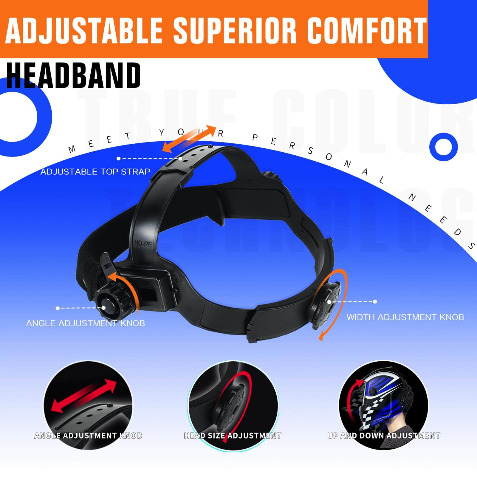 【Comfort Durable Welding Hood】Balanced with an adjustable and fatigue-free comfortable welding helmet headgear. Ergonomically welding helmet makes it comfortable and easy to wear. Thickened sponge forehead will protect you from injury. The knobs on both sides can adjust the angle, and the knob at the back can adjust the tightness of the headband, suitable for people with different head circumference.