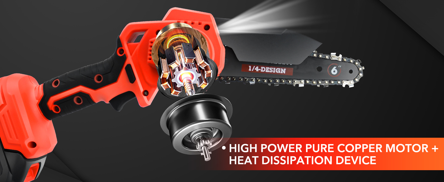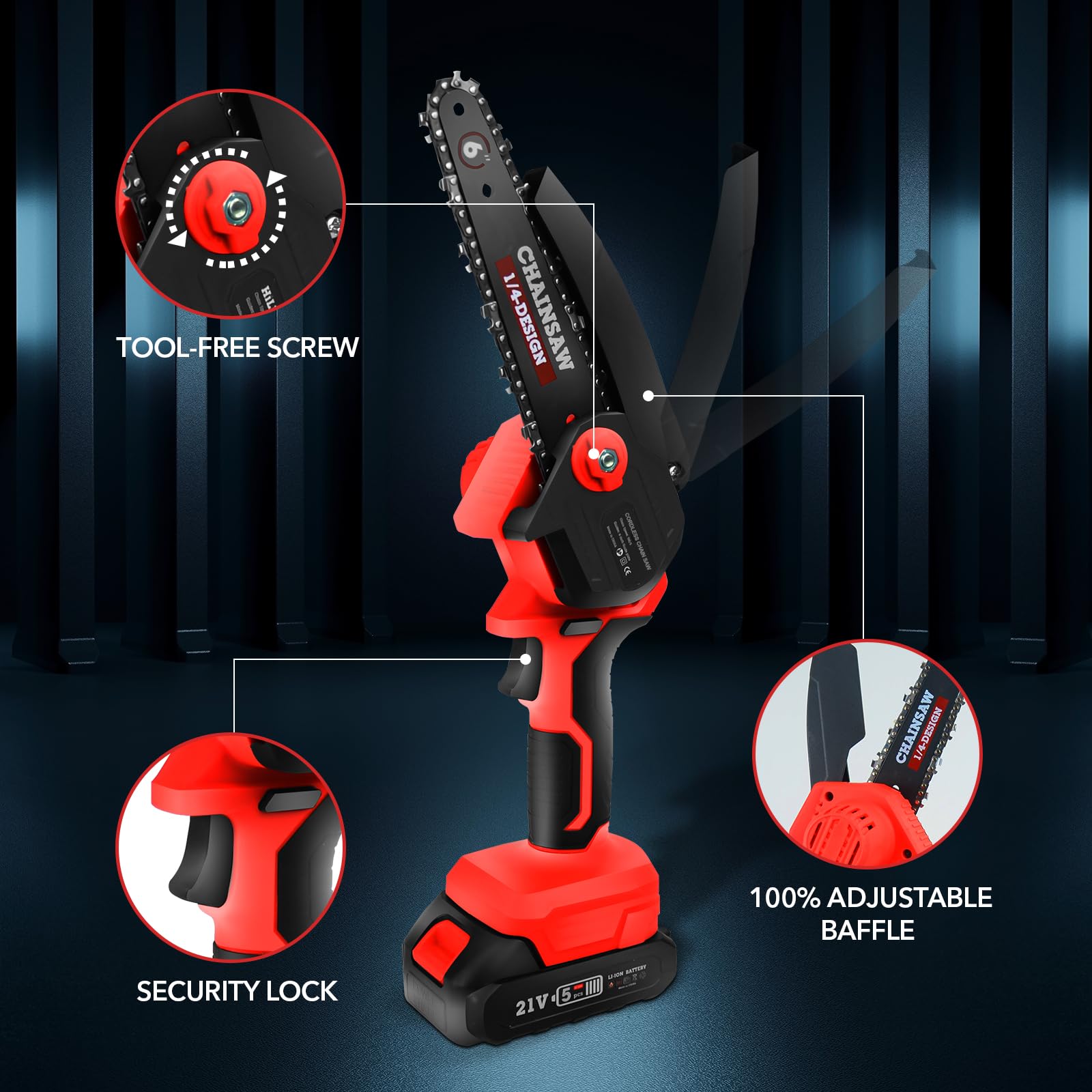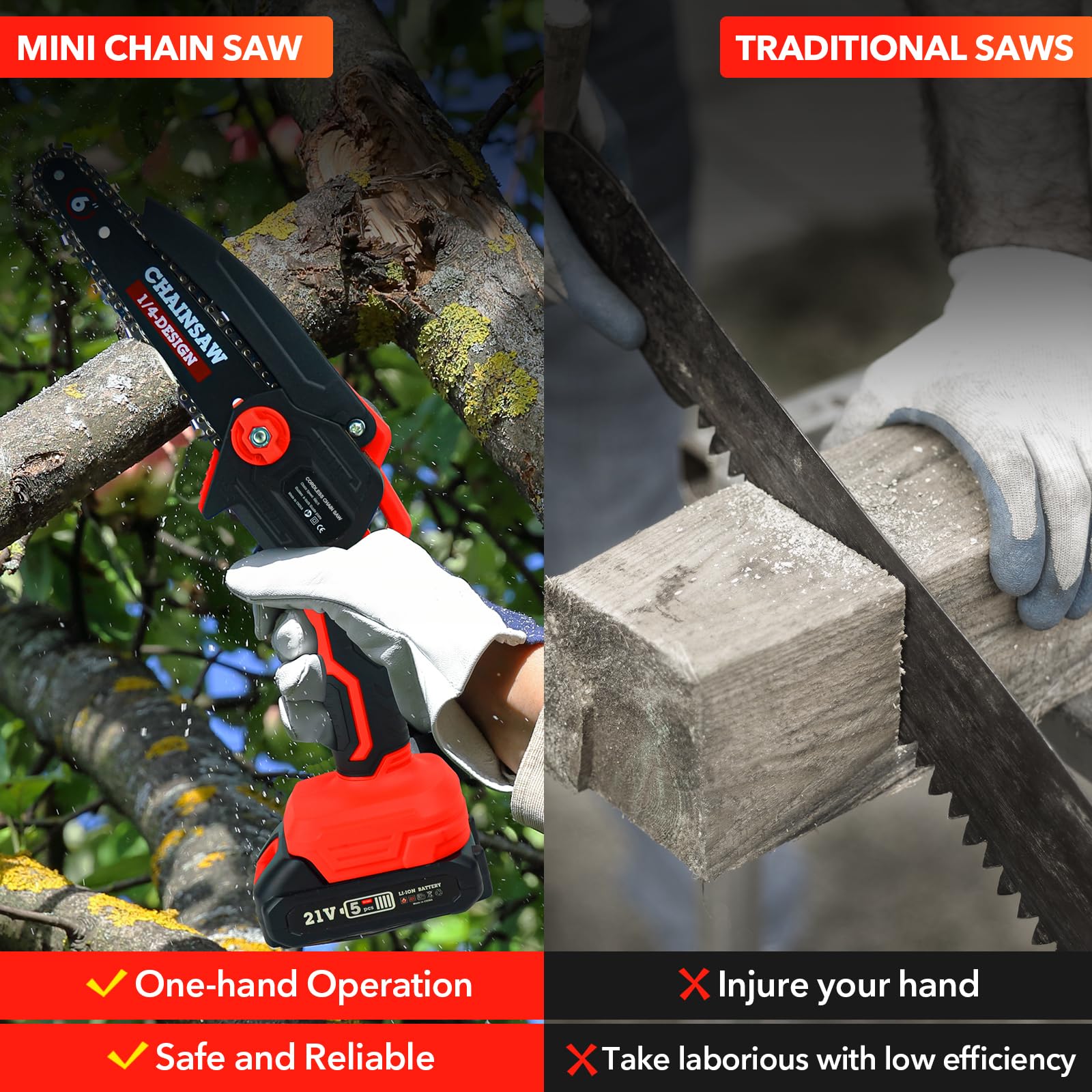 STRONG DYNAMIC SYSTEM: Mini 6 inch Chainsaw adapts a high-quality guide chain that has undergone a deep quenching process to ensure smooth cutting. In addition, it features a pure copper motor that provides your tool with longer run-time, more torque, and more power, which leads to less wear and tear, extending the lifetime of the mini chain saw.