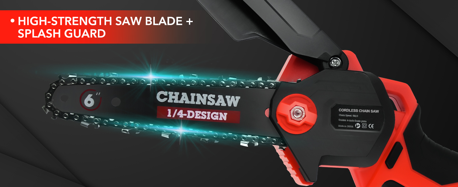 MULTIPLE SAFETY PROTECTIONS: The safety lock must be pressed before starting using mini chain saw cordless, and then small chain saw is used while pressing the trigger, so there is no need to worry about accidental injury. Besides, safety baffles are designed to prevent the wood from splashing. Very suitable for family and outdoor work, even women and the elderly can easily control it.